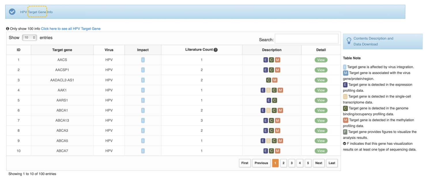 The Target Gene feature provides information for the target gene affected by viral insertion or virus gene/protein regulation. The Impact column in the table provides information on whether the gene has been mentioned in studies related to mutation or integration. The Description column in the table provides information on whether the gene provides virus-related omics data (which level of data is included) and whether a visualization graph is provided. A description of each tag is as follows: