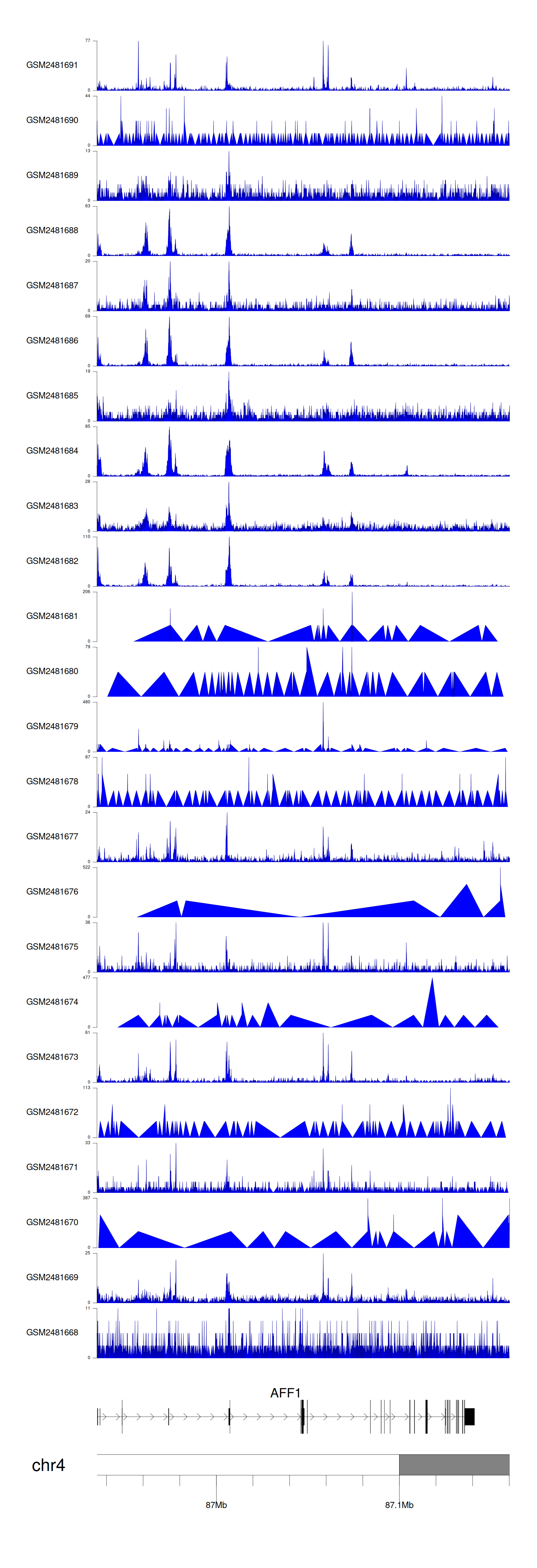 This gene encodes a member of the AF4/ lymphoid nuclear protein related to the Fragile X E syndrome (FRAXE) family of proteins, which have been implicated in human childhood lymphoblastic leukemia, fragile chromosome X intellectual disability, and ataxia. It is the prevalent mixed-lineage leukemia fusion gene associated with spontaneous acute lymphoblastic leukemia. Members of this family have three conserved domains: an N-terminal homology domain, an AF4/ lymphoid nuclear protein domain, and a C-terminal homology domain. The protein functions as a regulator of RNA polymerase II-mediated transcription through elongation and chromatin remodeling functions. Through RNA interference screens, this gene has been shown to promote the expression of CD133, a plasma membrane glycoprotein required for leukemia cell survival. Alternative splicing results in multiple transcript variants. [provided by RefSeq, Jul 2017] |
