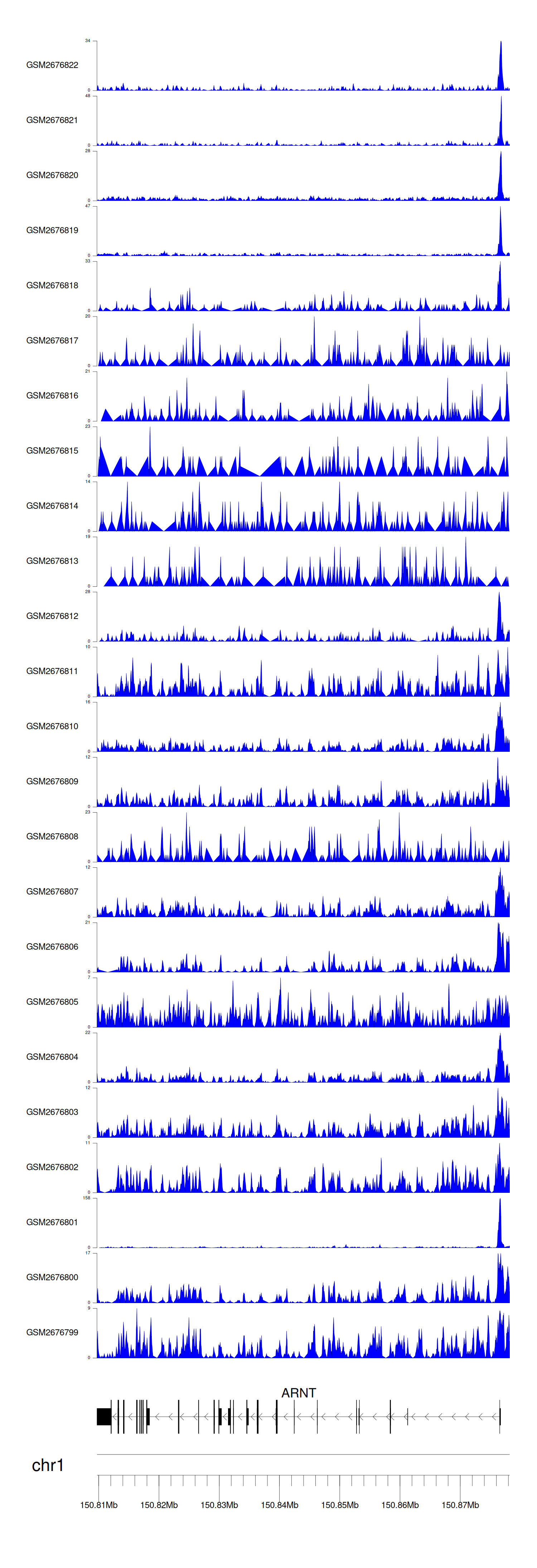 Summary This gene encodes a protein containing a basic helix-loop-helix domain and two characteristic PAS domains along with a PAC domain. The encoded protein binds to ligand-bound aryl hydrocarbon receptor and aids in the movement of this complex to the nucleus, where it promotes the expression of genes involved in xenobiotic metabolism. This protein is also a co-factor for transcriptional regulation by hypoxia-inducible factor 1. Chromosomal translocation of this locus with the ETV6 (ets variant 6) gene on chromosome 12 have been described in leukemias. Alternative splicing results in multiple transcript variants. [provided by RefSeq, Oct 2013]