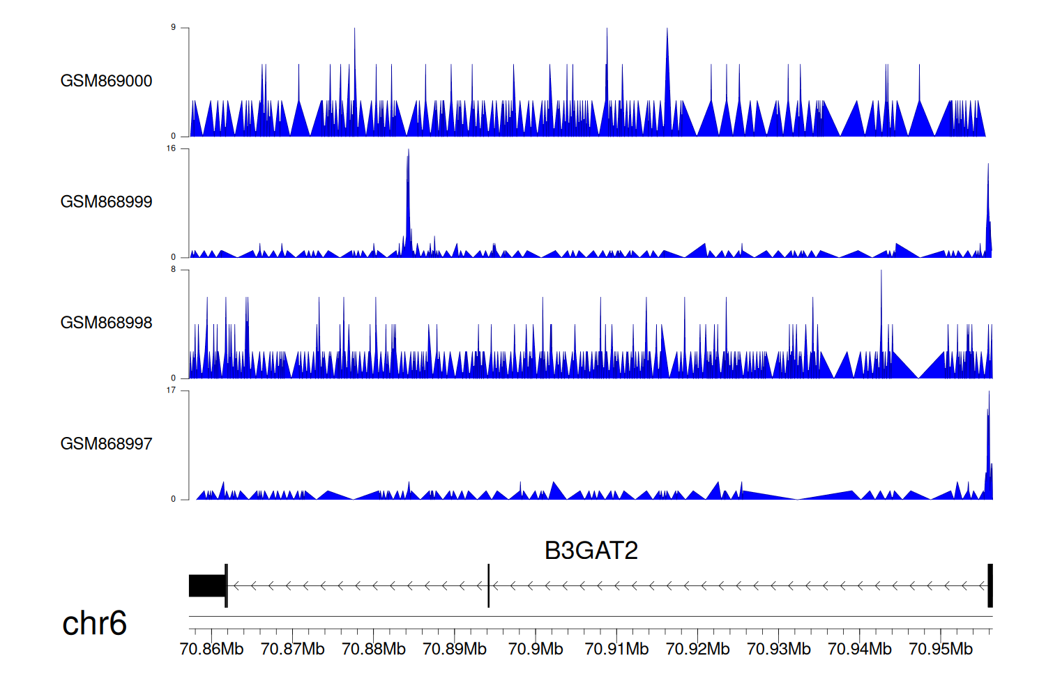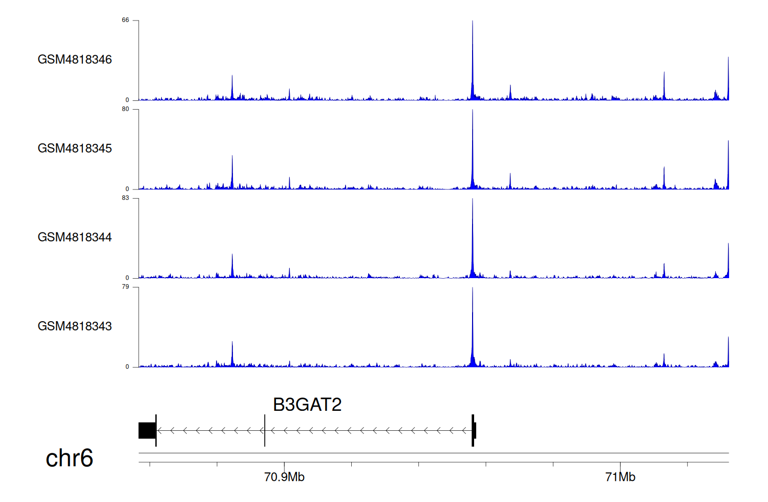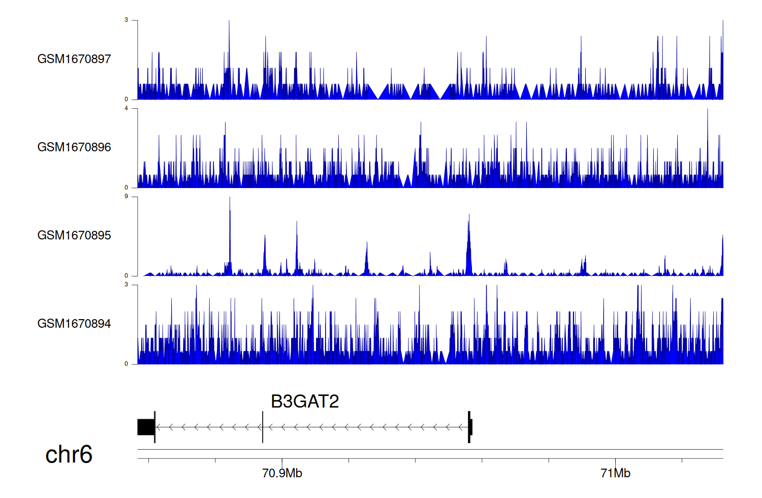 > Dataset: GSE68402 - B3GAT2 peak across samples