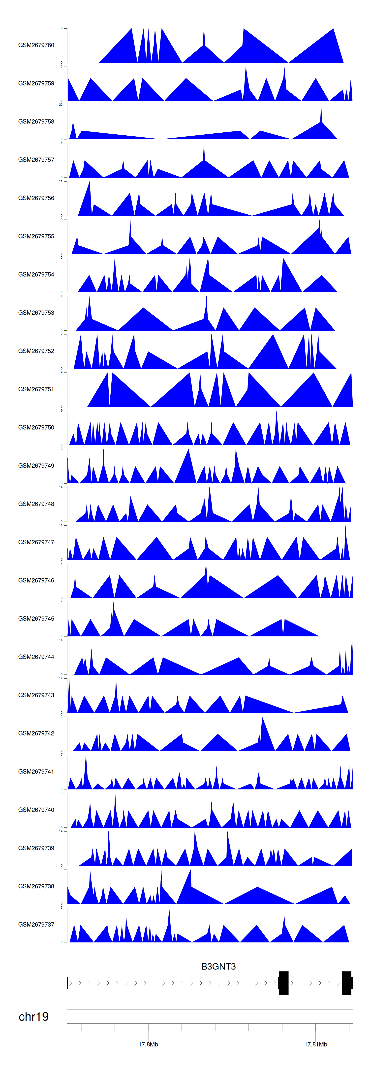 > Dataset: GSE100376 - B3GNT3 peak across samples