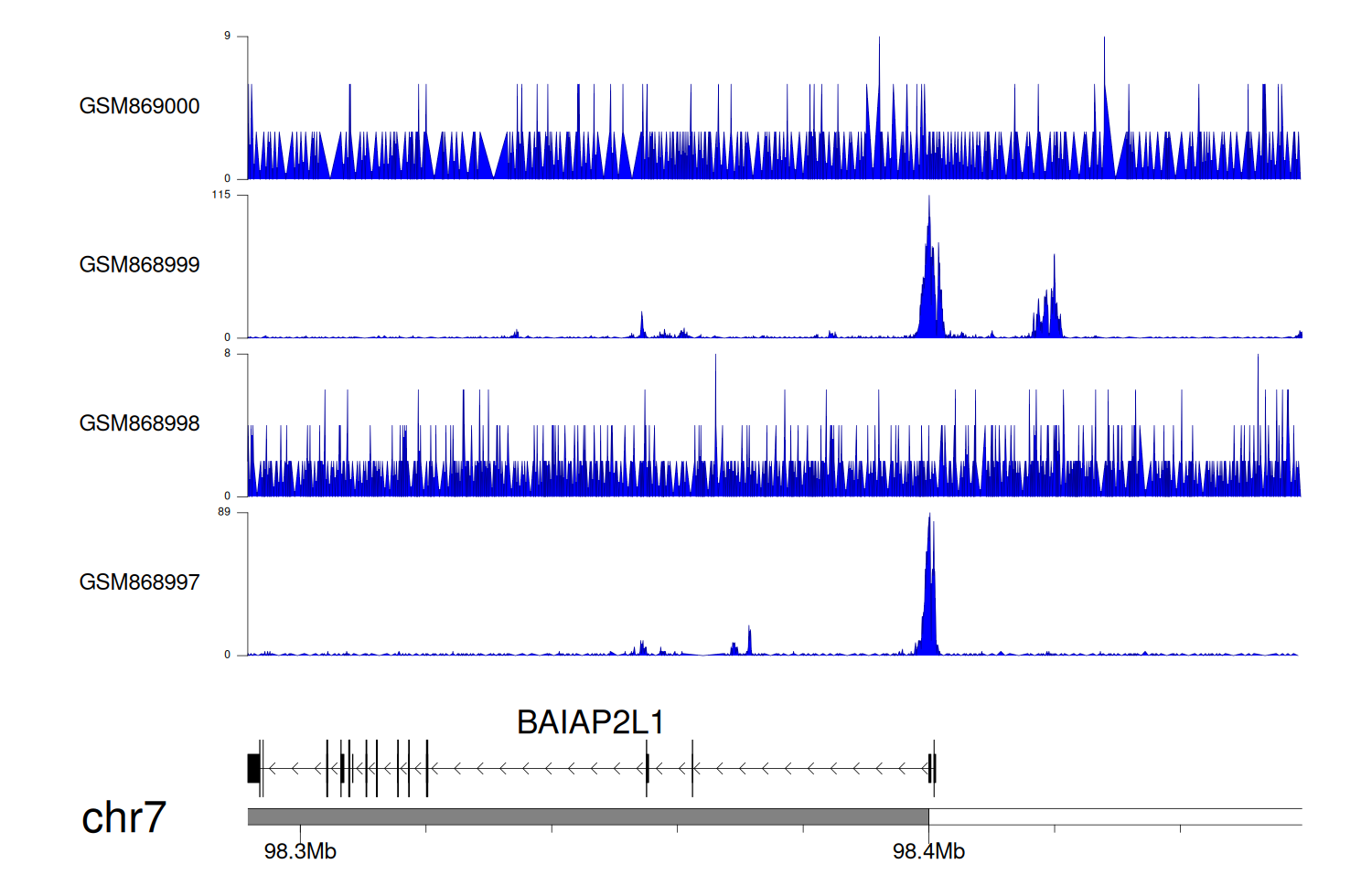 > Dataset: GSE68402 - BAIAP2L1 peak across samples