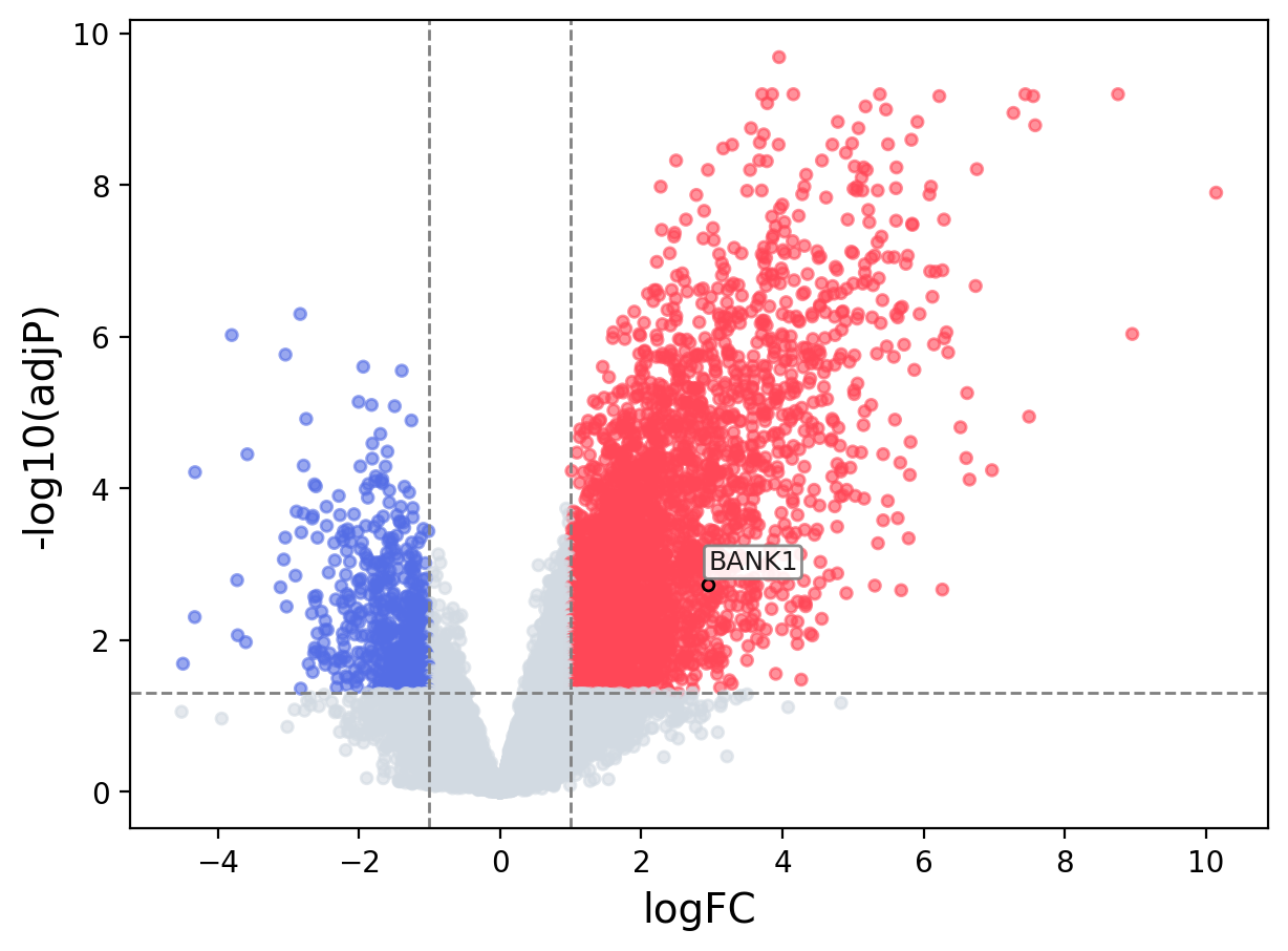 When the query gene is differentially changed in the dataset, a volcano/bar plot will be displayed.