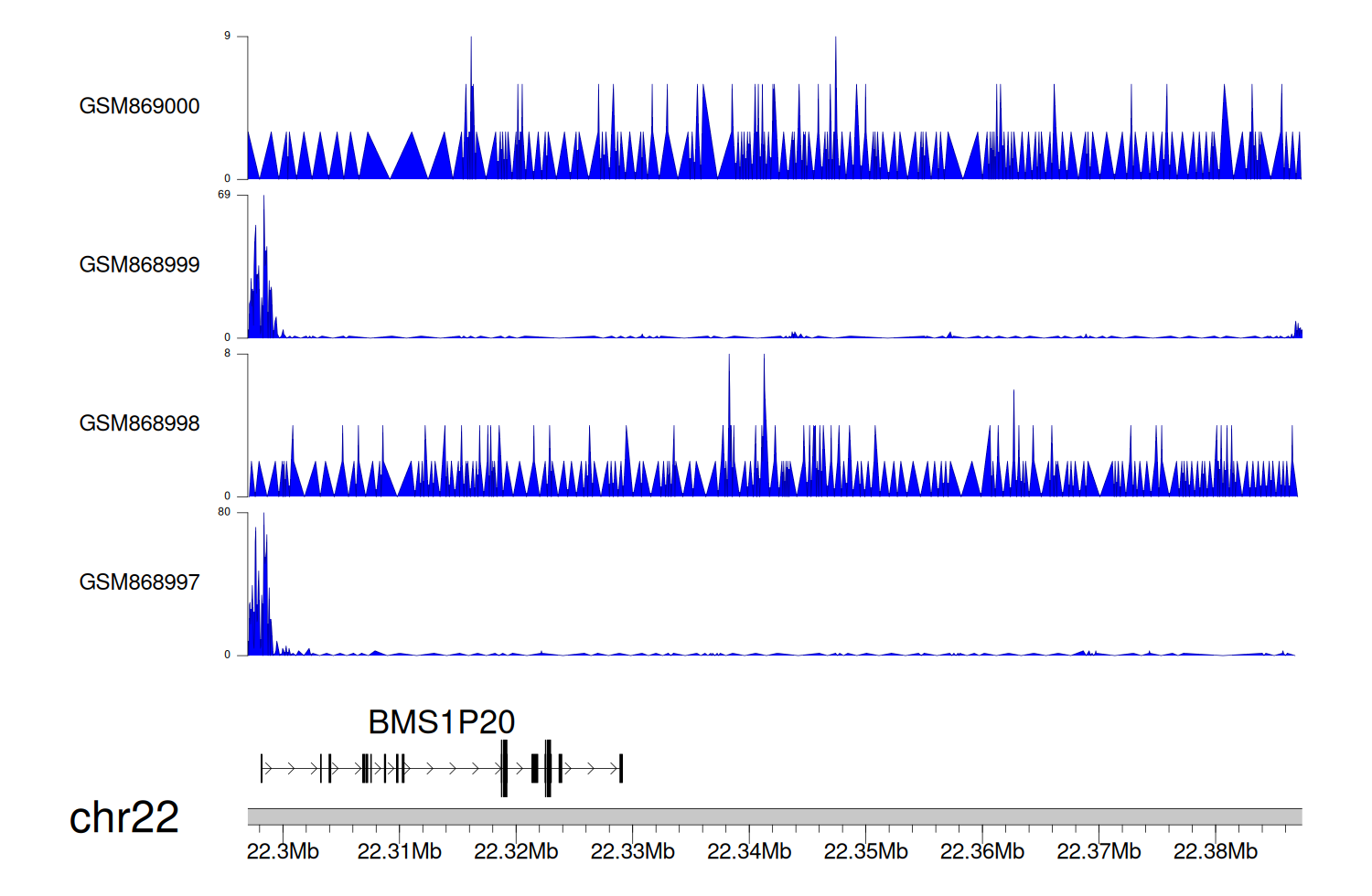 > Dataset: GSE35465 - BMS1P20 peak across samples