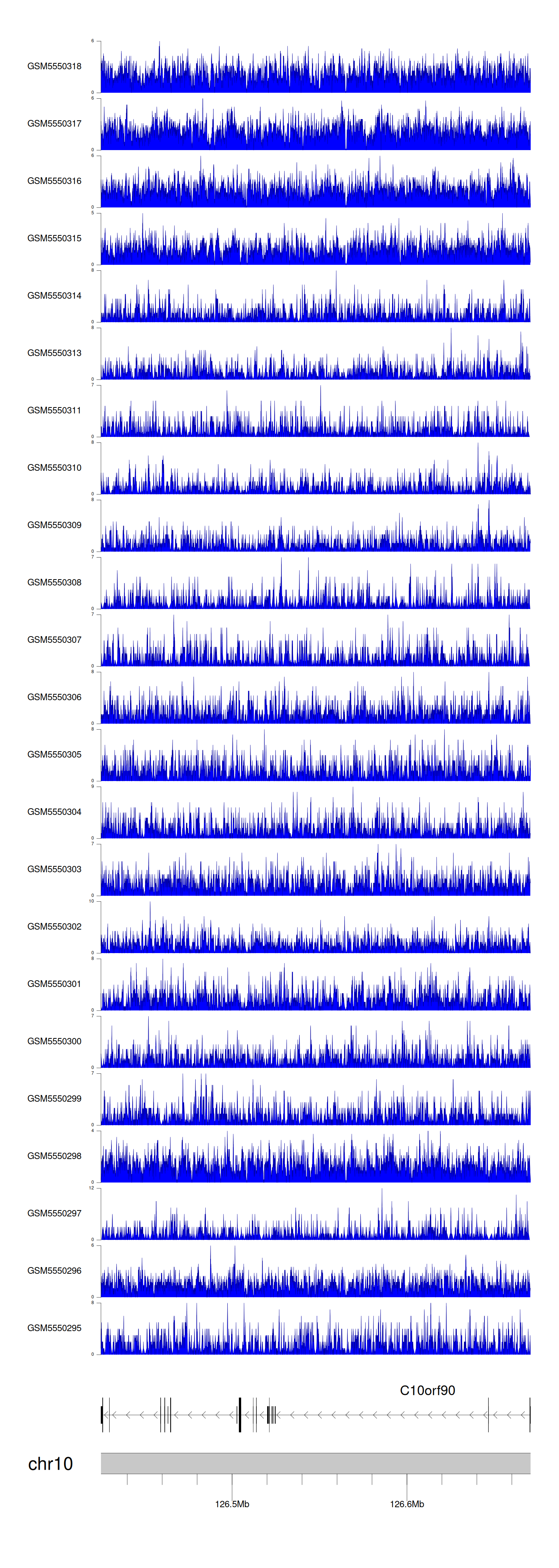 > Dataset: GSE143026 - C10orf90 peak across samples
