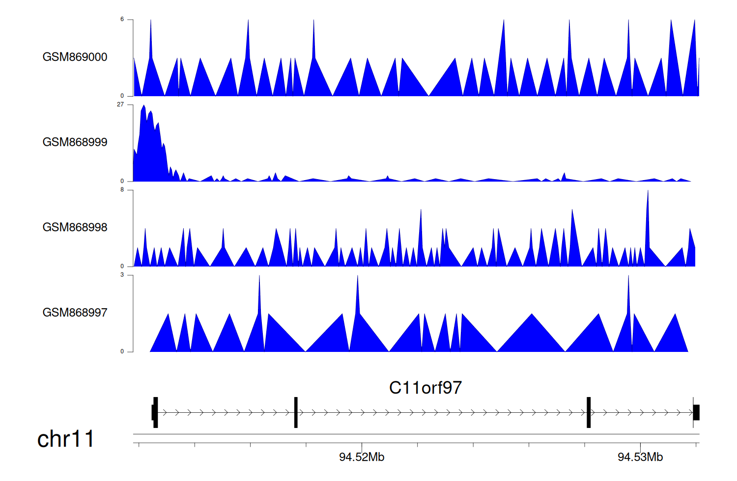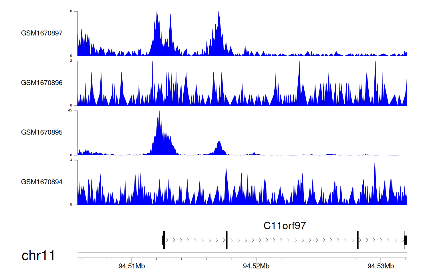 > Dataset: GSE68402 - C11orf97 peak across samples