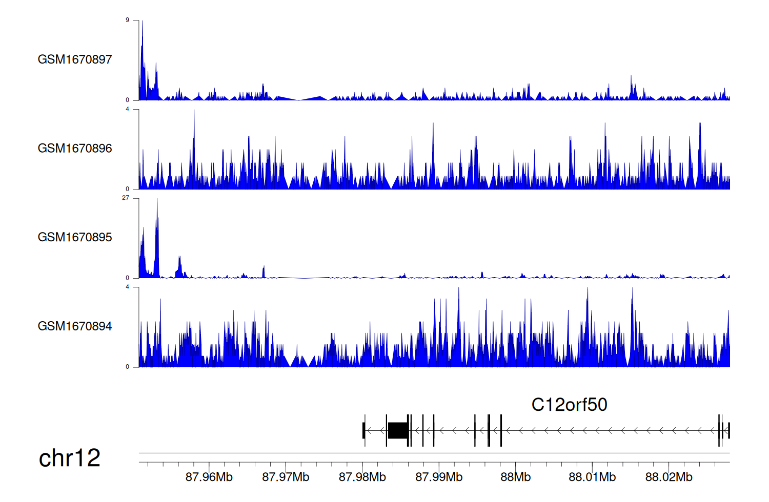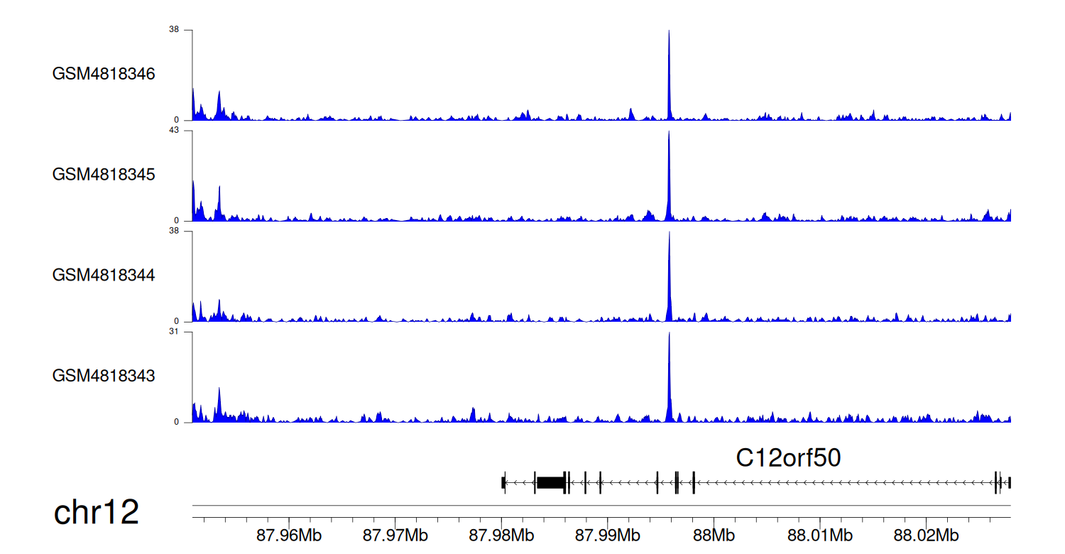 > Dataset: GSE131257 - C12orf50 peak across samples