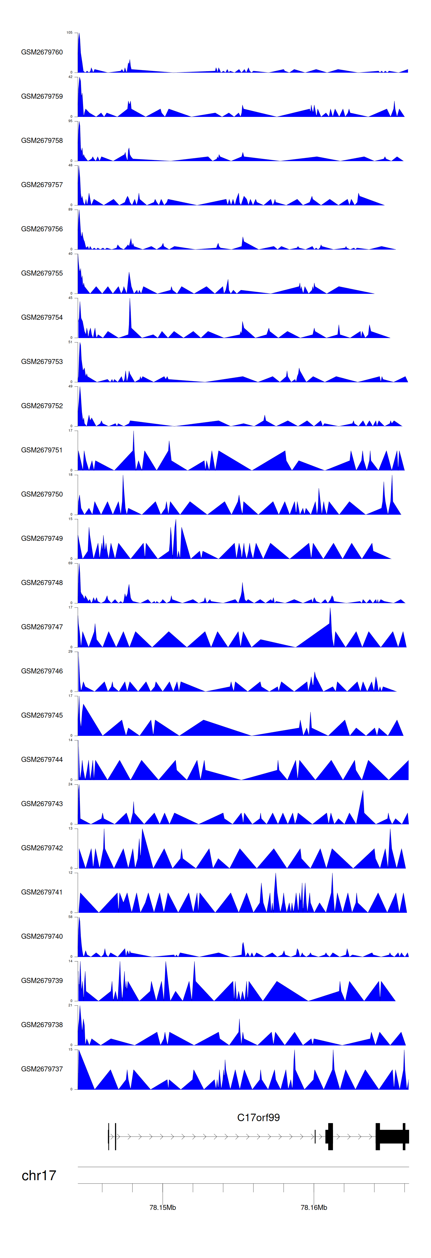 > Dataset: GSE100376 - C17orf99 peak across samples