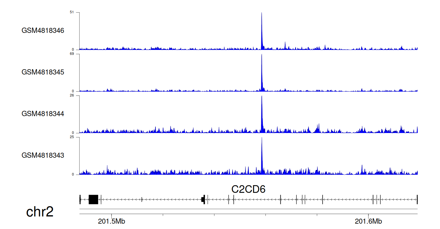 > Dataset: GSE131257 - C2CD6 peak across samples