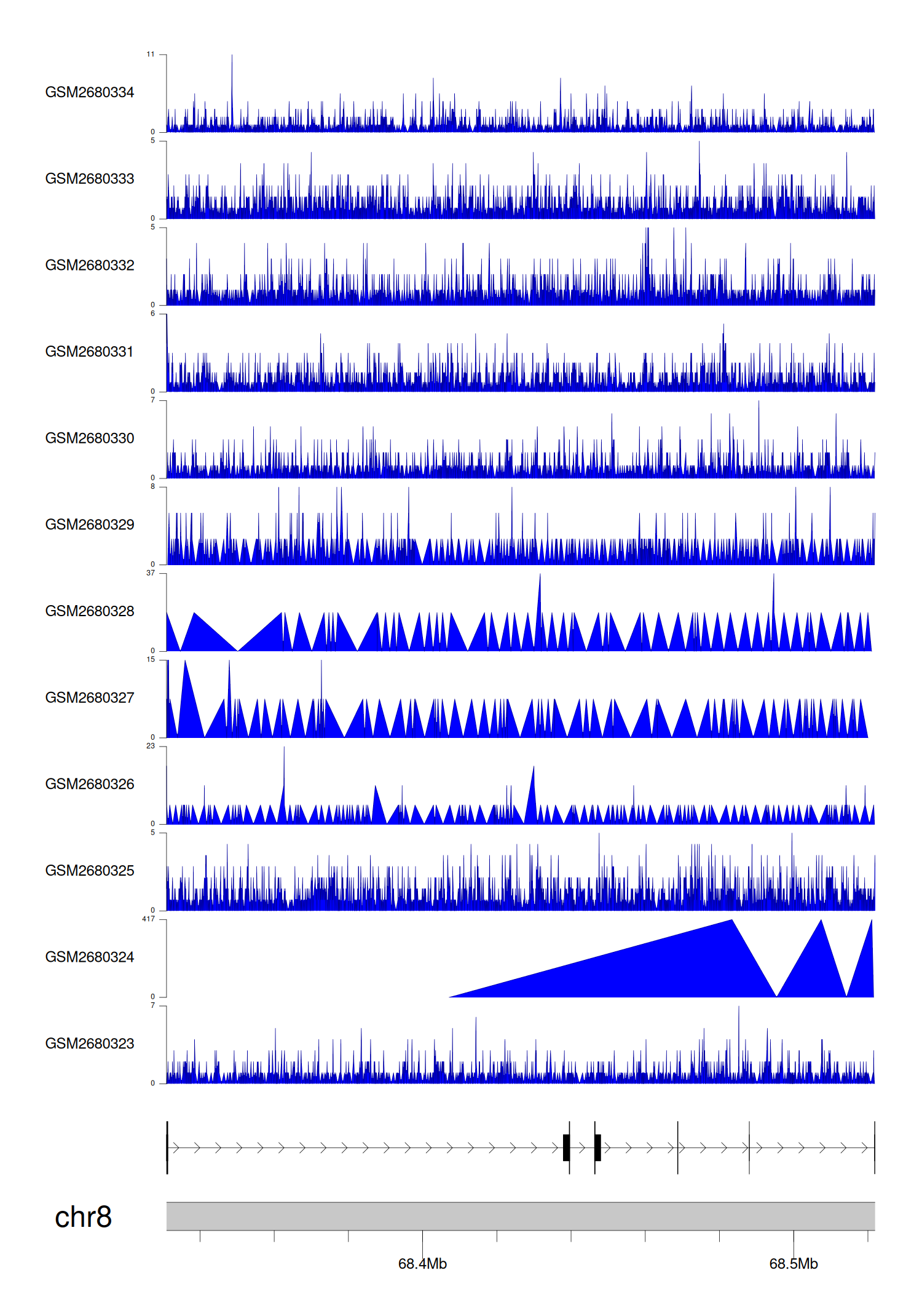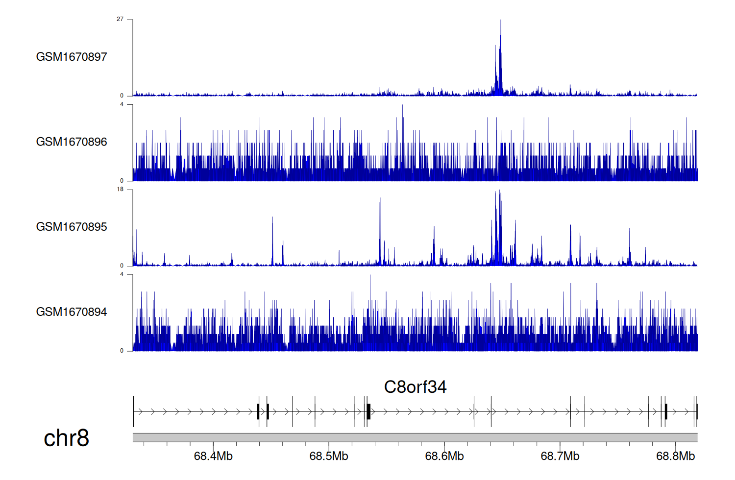> Dataset: GSE68402 - C8orf34 peak across samples