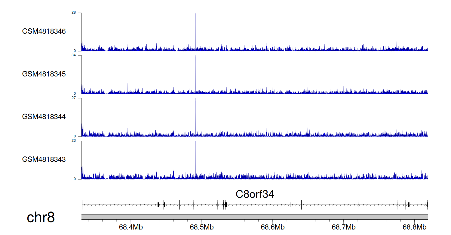 > Dataset: GSE131257 - C8orf34 peak across samples