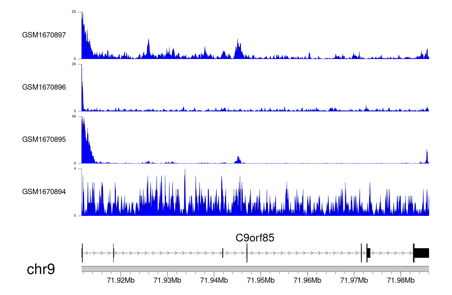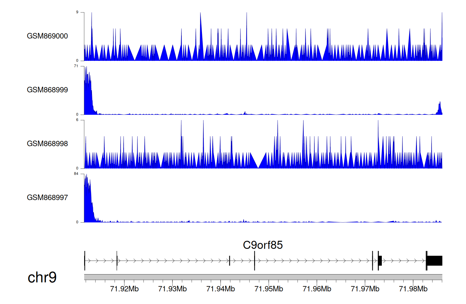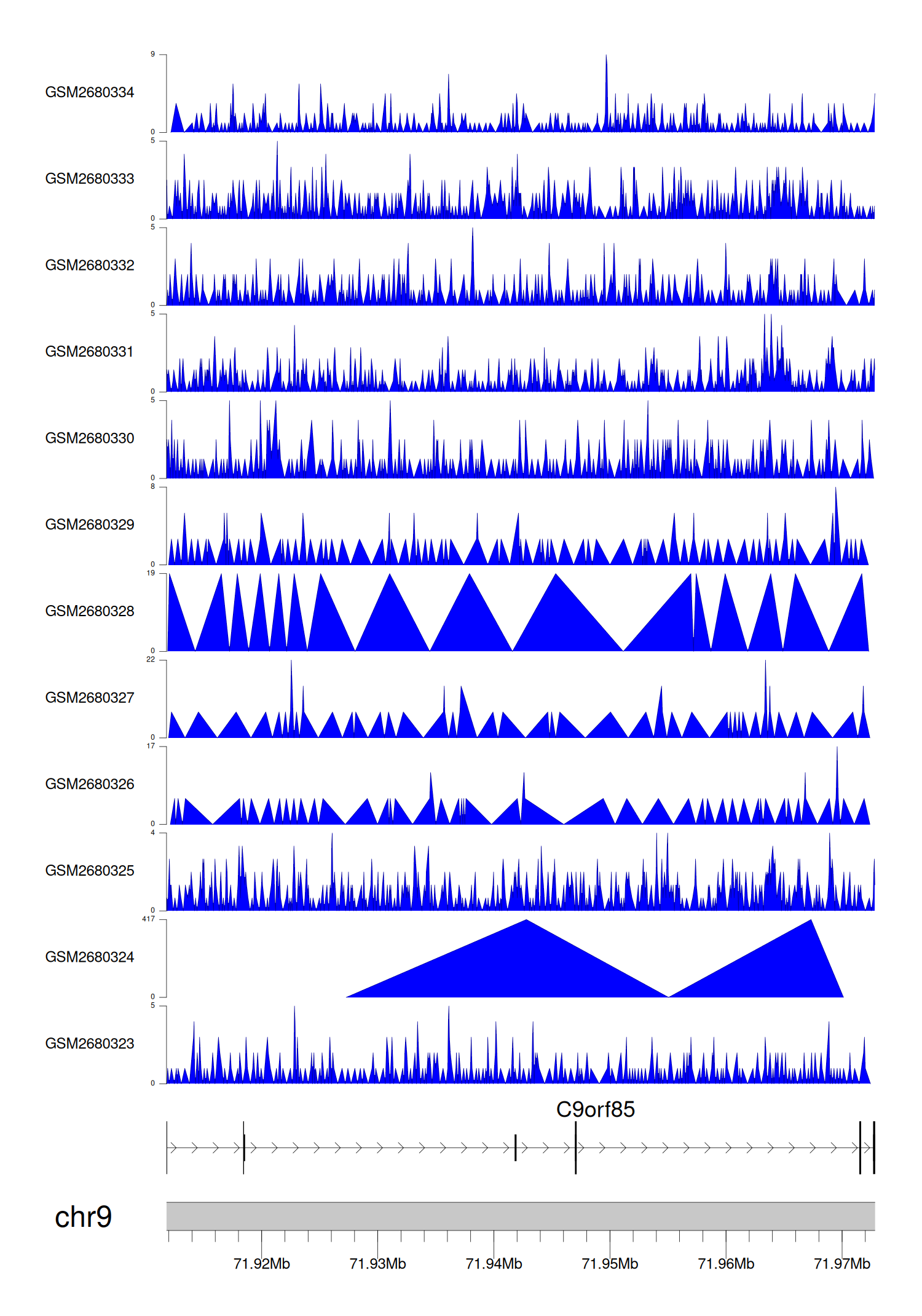 > Dataset: GSE68402 - C9orf85 peak across samples