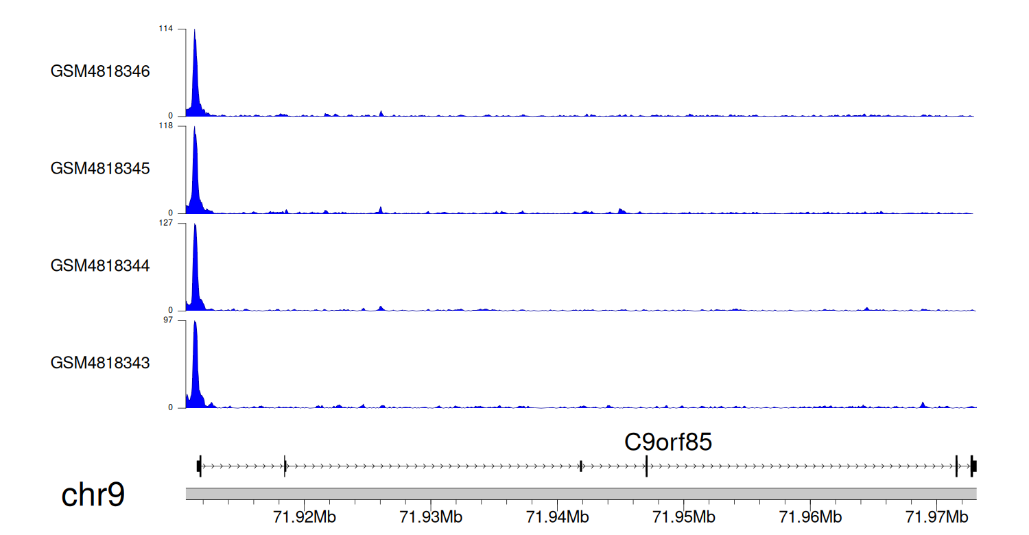 > Dataset: GSE131257 - C9orf85 peak across samples