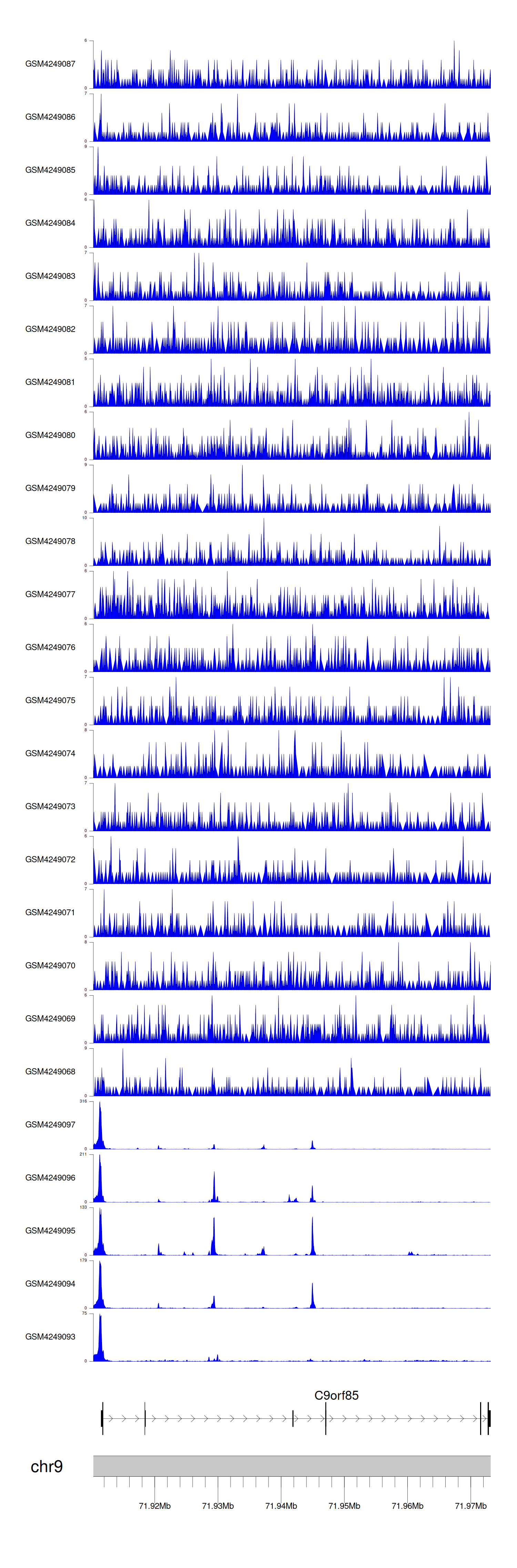 > Dataset: GSE143026 - C9orf85 peak across samples