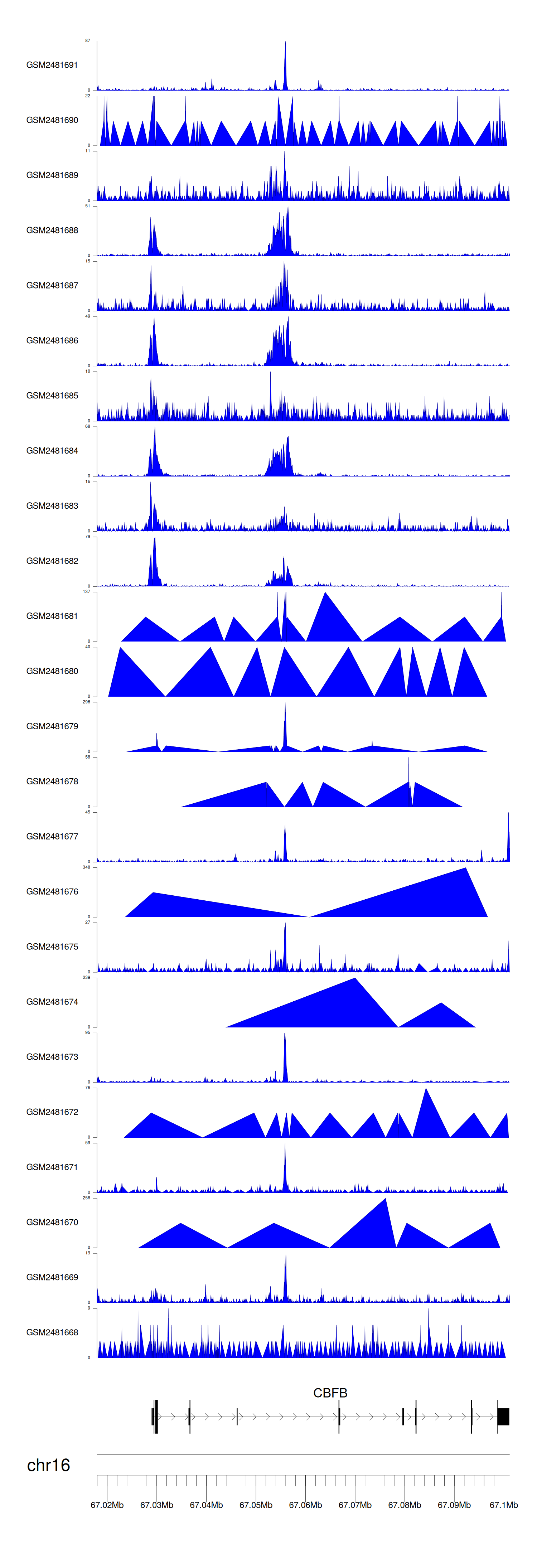 The protein encoded by this gene is the beta subunit of a heterodimeric core-binding transcription factor belonging to the PEBP2/CBF transcription factor family which master-regulates a host of genes specific to hematopoiesis (e.g., RUNX1) and osteogenesis (e.g., RUNX2). The beta subunit is a non-DNA binding regulatory subunit; it allosterically enhances DNA binding by alpha subunit as the complex binds to the core site of various enhancers and promoters, including murine leukemia virus, polyomavirus enhancer, T-cell receptor enhancers and GM-CSF promoters. Alternative splicing generates two mRNA variants, each encoding a distinct carboxyl terminus. In some cases, a pericentric inversion of chromosome 16 [inv(16)(p13q22)] produces a chimeric transcript consisting of the N terminus of core-binding factor beta in a fusion with the C-terminal portion of the smooth muscle myosin heavy chain 11. This chromosomal rearrangement is associated with acute myeloid leukemia of the M4Eo subtype. Two transcript variants encoding different isoforms have been found for this gene. [provided by RefSeq, Jul 2008] |