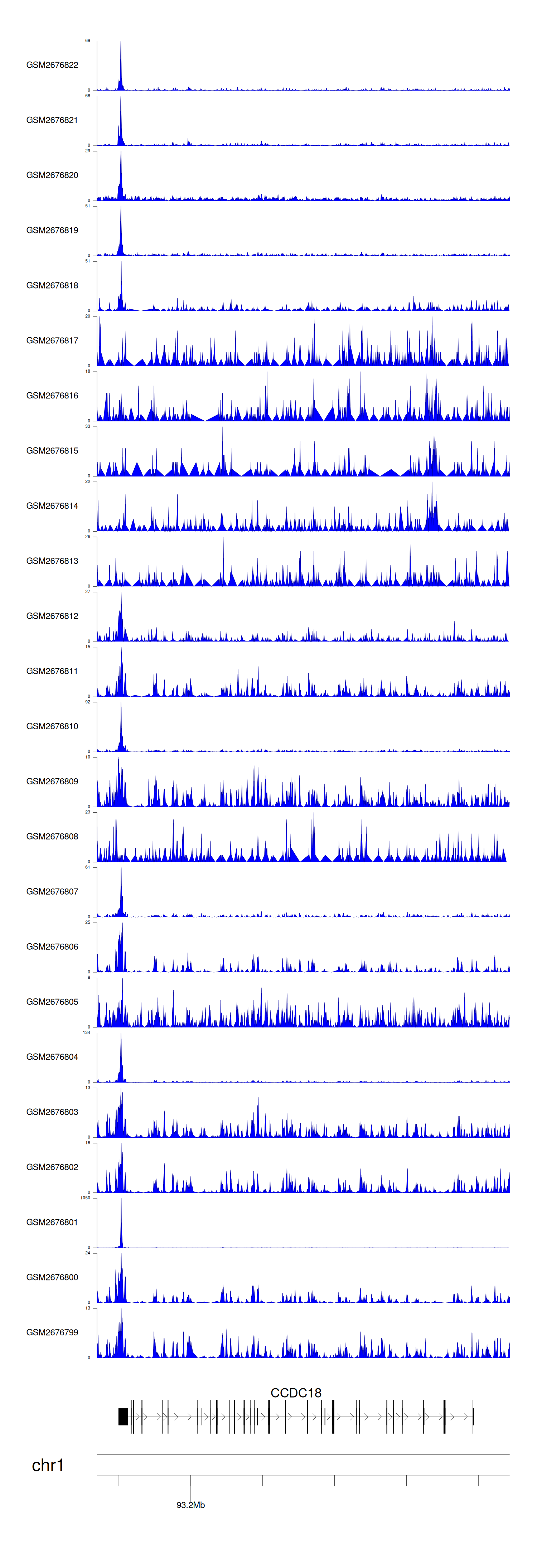 > Dataset: GSE100376 - CCDC18 peak across samples