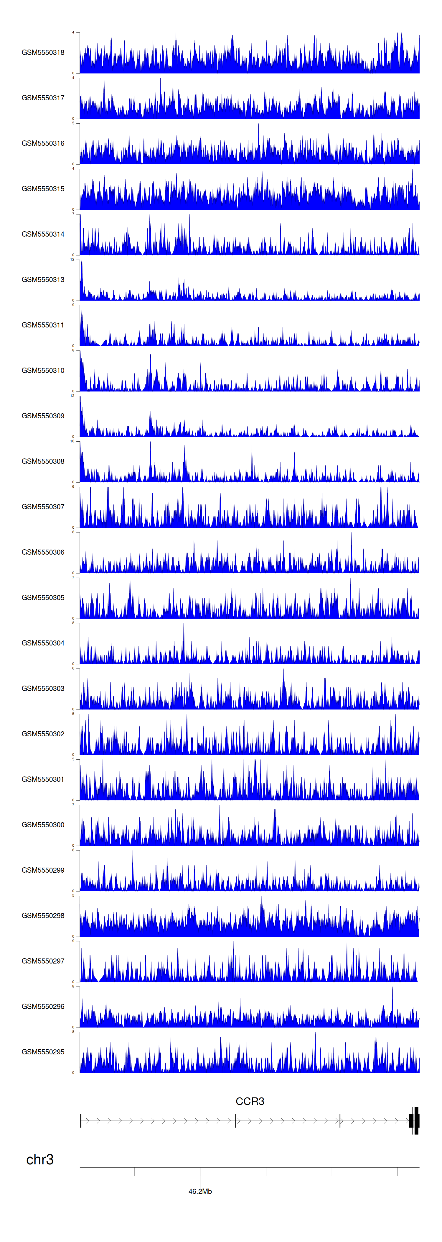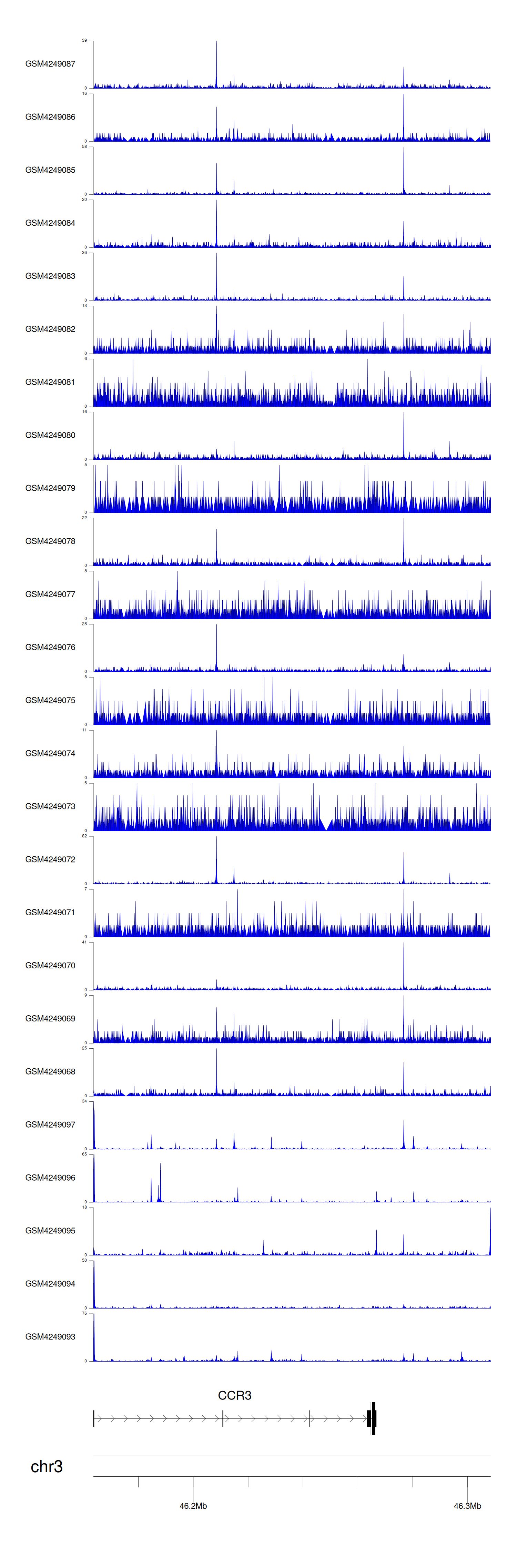 The protein encoded by this gene is a receptor for C-C type chemokines. It belongs to family 1 of the G protein-coupled receptors. This receptor binds and responds to a variety of chemokines, including eotaxin (CCL11), eotaxin-3 (CCL26), MCP-3 (CCL7), MCP-4 (CCL13), and RANTES (CCL5). It is highly expressed in eosinophils and basophils, and is also detected in TH1 and TH2 cells, as well as in airway epithelial cells. This receptor may contribute to the accumulation and activation of eosinophils and other inflammatory cells in the allergic airway. It is also known to be an entry co-receptor for HIV-1. This gene and seven other chemokine receptor genes form a chemokine receptor gene cluster on the chromosomal region 3p21. Alternatively spliced transcript variants have been described. [provided by RefSeq, Sep 2009] |