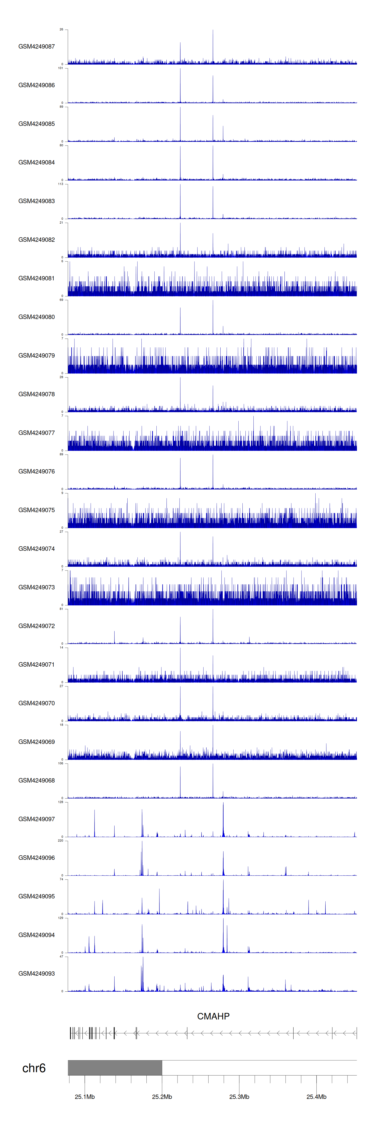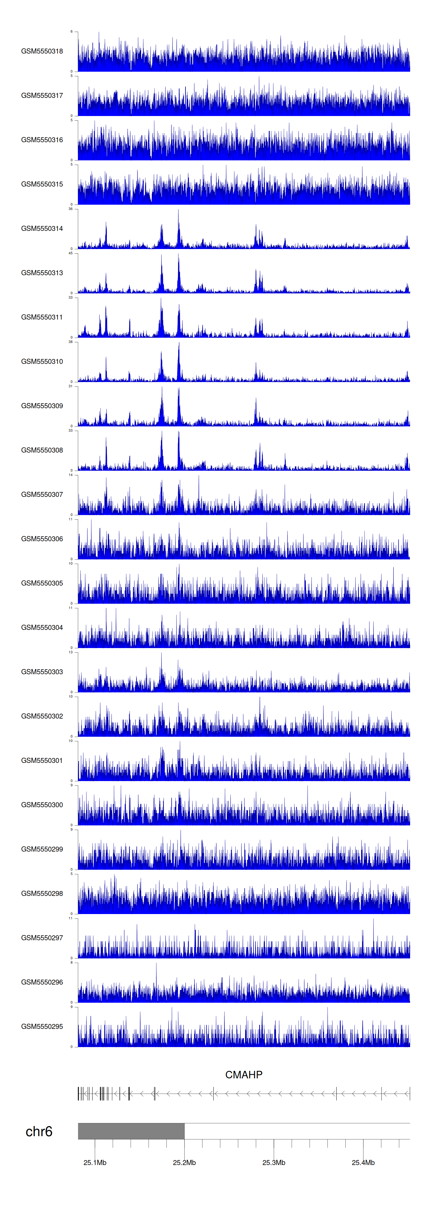 Sialic acids are terminal components of the carbohydrate chains of glycoconjugates involved in ligand-receptor, cell-cell, and cell-pathogen interactions. The two most common forms of sialic acid found in mammalian cells are N-acetylneuraminic acid (Neu5Ac) and its hydroxylated derivative, N-glycolylneuraminic acid (Neu5Gc). Studies of sialic acid distribution show that Neu5Gc is not detectable in normal human tissues although it was an abundant sialic acid in other mammals. Neu5Gc is, in actuality, immunogenic in humans. The absense of Neu5Gc in humans is due to a deletion within the human gene CMAH encoding cytidine monophosphate-N-acetylneuraminic acid hydroxylase, an enzyme responsible for Neu5Gc biosynthesis. Sequences encoding the mouse, pig, and chimpanzee hydroxylase enzymes were obtained by cDNA cloning and found to be highly homologous. However, the homologous human cDNA differs from these cDNAs by a 92-bp deletion in the 5' region. This deletion, corresponding to exon 6 of the mouse hydroxylase gene, causes a frameshift mutation and premature termination of the polypeptide chain in human. It seems unlikely that the truncated human hydroxylase mRNA encodes for an active enzyme explaining why Neu5Gc is undetectable in normal human tissues. Human genomic DNA also shows evidence of this deletion which does not occur in the genomes of African great apes. Nonetheless, the CMAH gene maps to 6p21.32 in humans and great apes indicating that mutation of the CMAH gene occurred following human divergence from chimpanzees and bonobos. [provided by RefSeq, Jul 2008] |