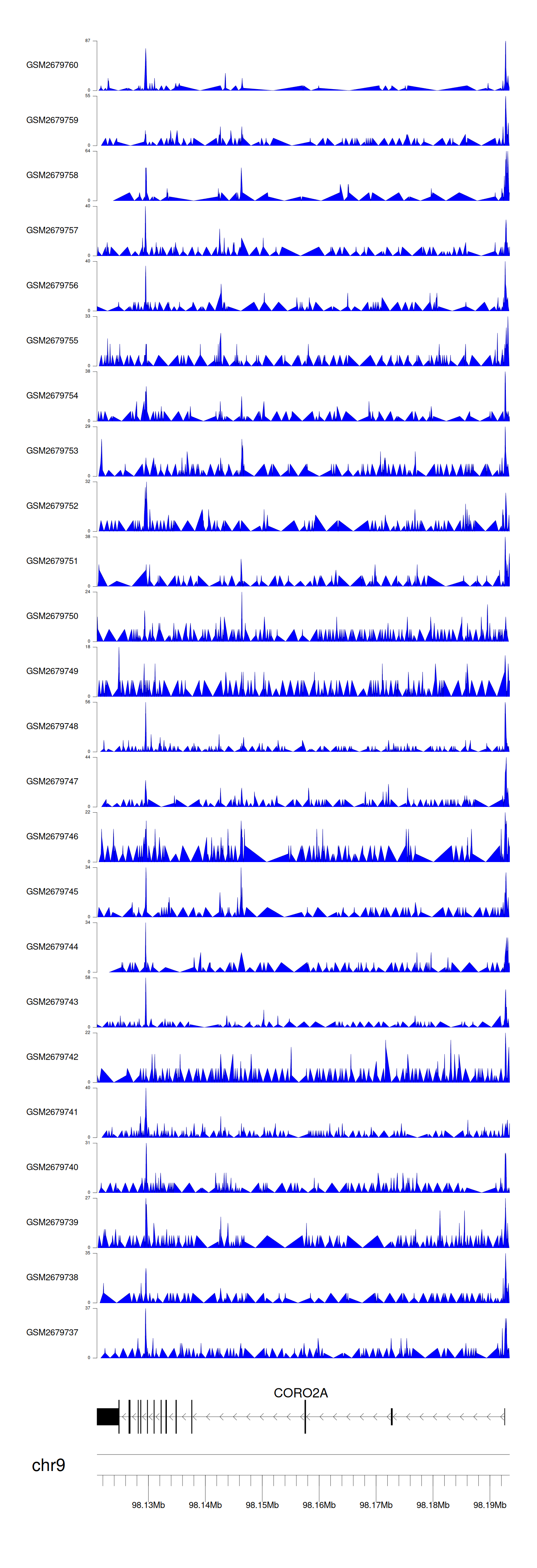 > Dataset: GSE100376 - CORO2A peak across samples
