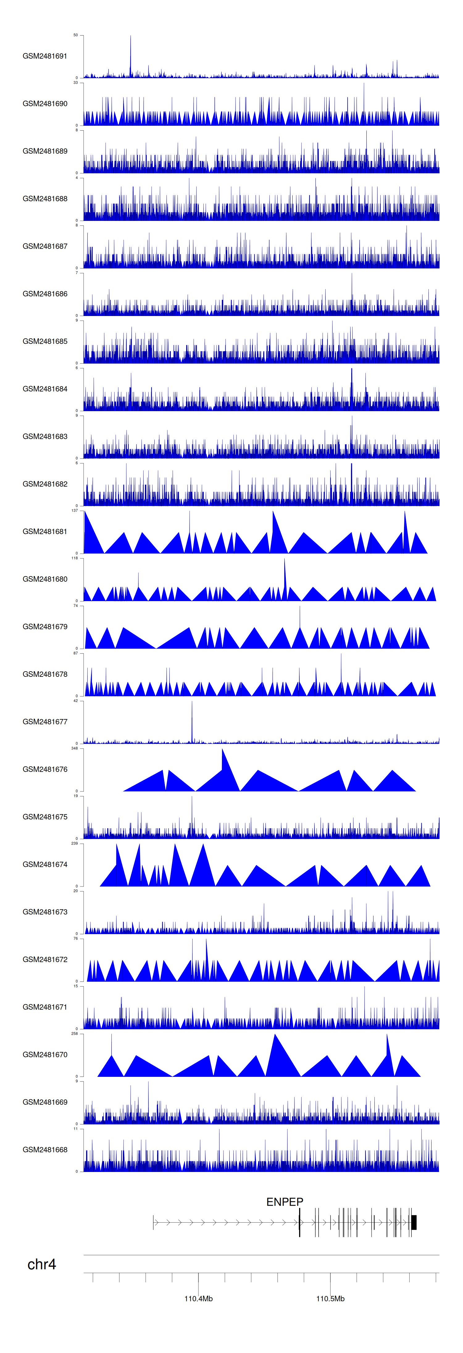 The ENPEP gene encodes glutamyl aminopeptidase, a type II integral membrane protein with an extracellular zinc-binding domain. This protein can upregulate blood pressure by cleaving the N-terminal aspartate from angiotensin II, and can regulate blood vessel formation and enhance tumorigenesis in some tissues. Along with ANPEP and DPP4, ENPEP was found to be a candidate co-receptor for the coronavirus SARS-CoV-2, which causes COVID-19. [provided by RefSeq, Apr 2020] |