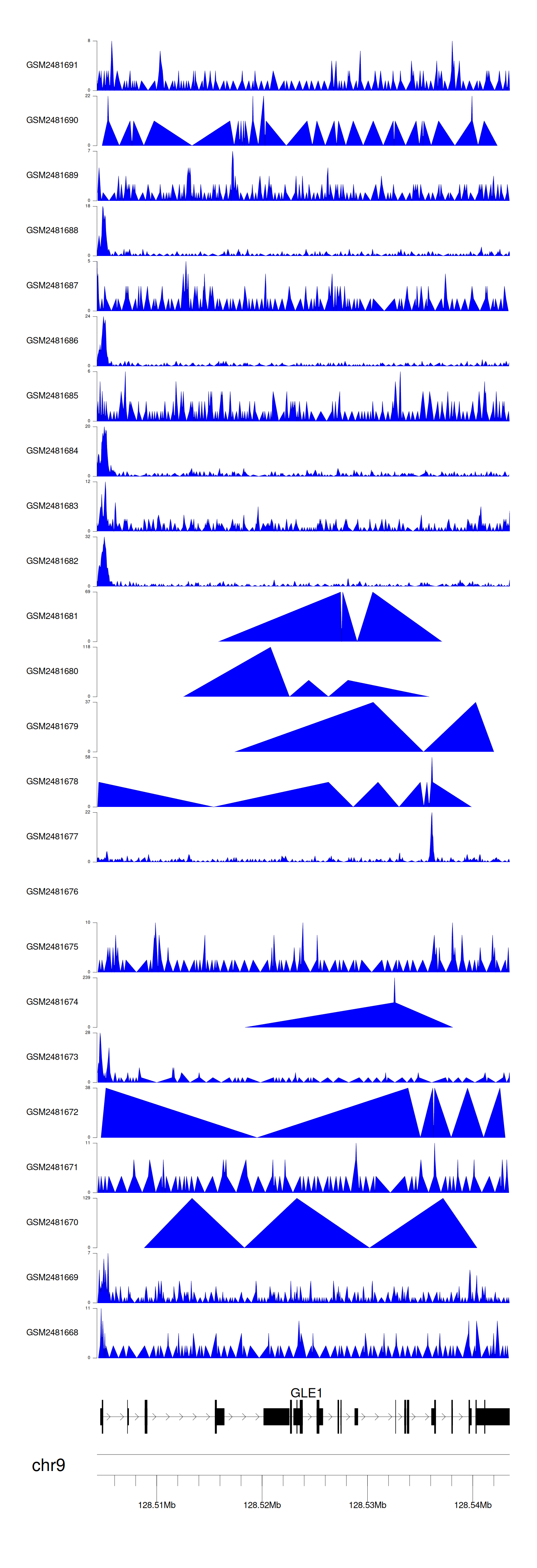 This gene encodes a predicted 75-kDa polypeptide with high sequence and structure homology to yeast Gle1p, which is nuclear protein with a leucine-rich nuclear export sequence essential for poly(A)+RNA export. Inhibition of human GLE1L by microinjection of antibodies against GLE1L in HeLa cells resulted in inhibition of poly(A)+RNA export. Immunoflourescence studies show that GLE1L is localized at the nuclear pore complexes. This localization suggests that GLE1L may act at a terminal step in the export of mature RNA messages to the cytoplasm. Two alternatively spliced transcript variants encoding different isoforms have been found for this gene. [provided by RefSeq, Jul 2008] |
