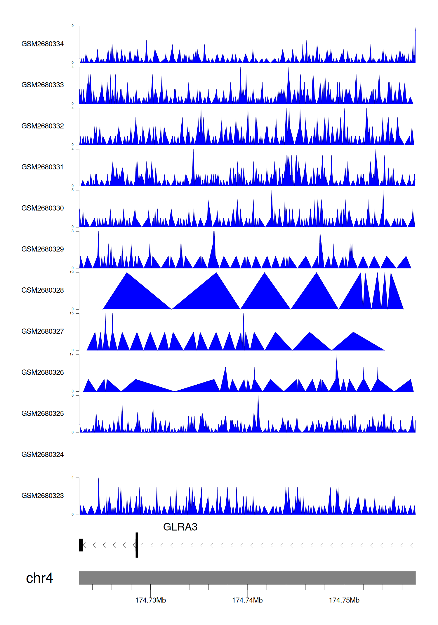 > Dataset: GSE100400 - GLRA3 peak across samples