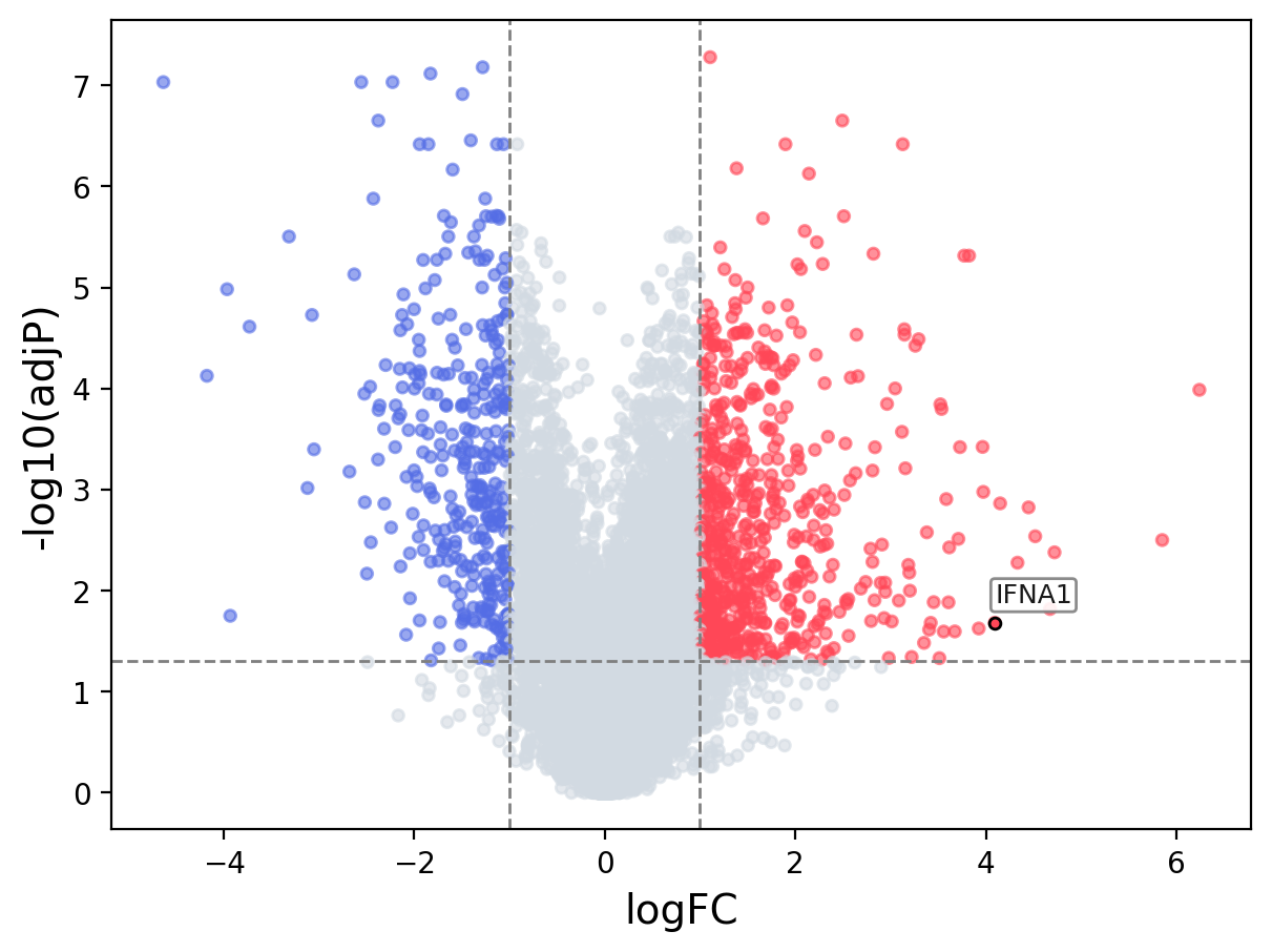When the query gene is differentially changed in the dataset, a volcano/bar plot will be displayed.