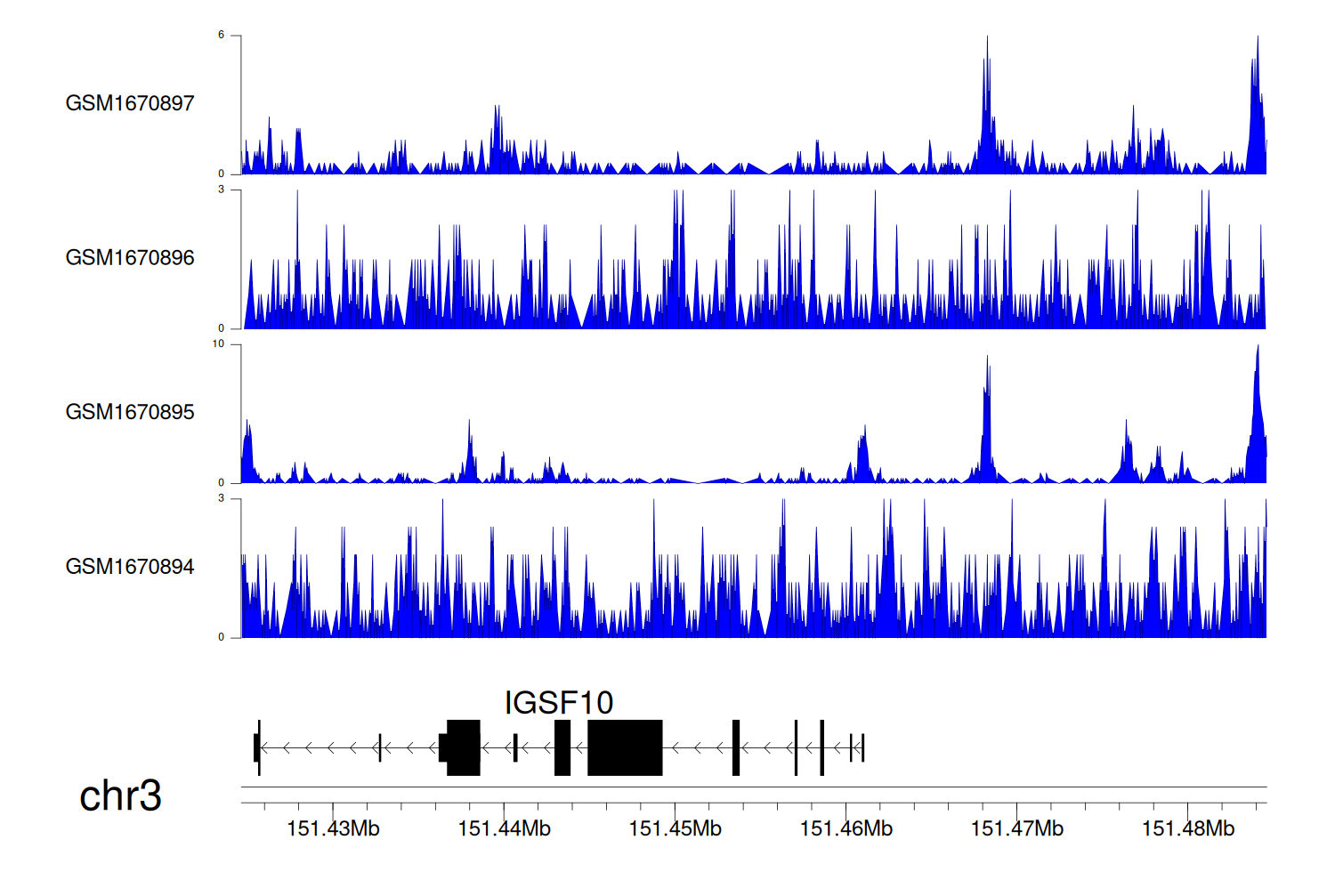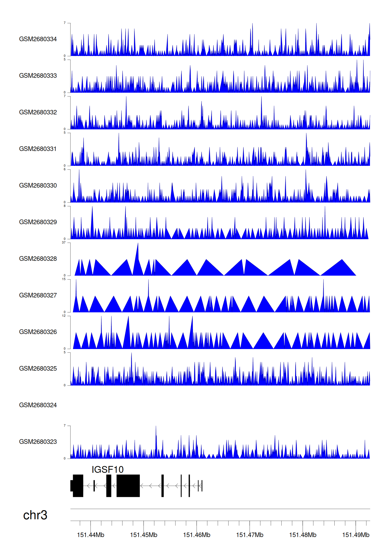 > Dataset: GSE68402 - IGSF10 peak across samples