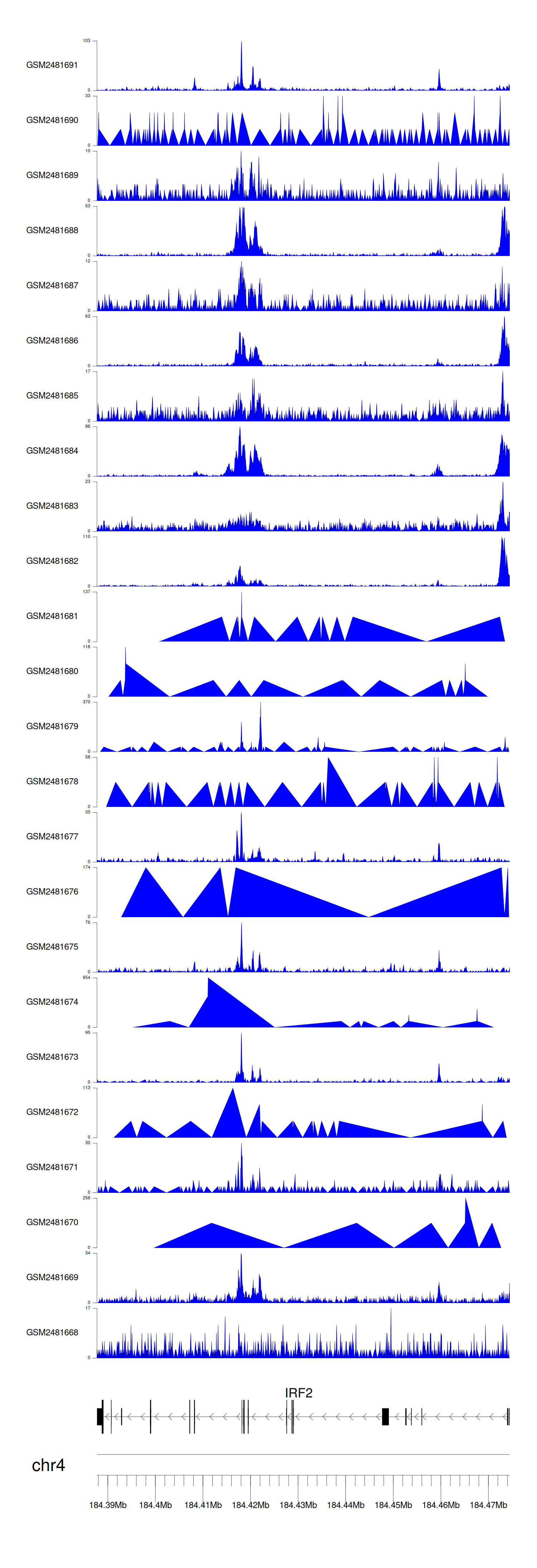 IRF2 encodes interferon regulatory factor 2, a member of the interferon regulatory transcription factor (IRF) family. IRF2 competitively inhibits the IRF1-mediated transcriptional activation of interferons alpha and beta, and presumably other genes that employ IRF1 for transcription activation. However, IRF2 also functions as a transcriptional activator of histone H4. [provided by RefSeq, Jul 2008] |