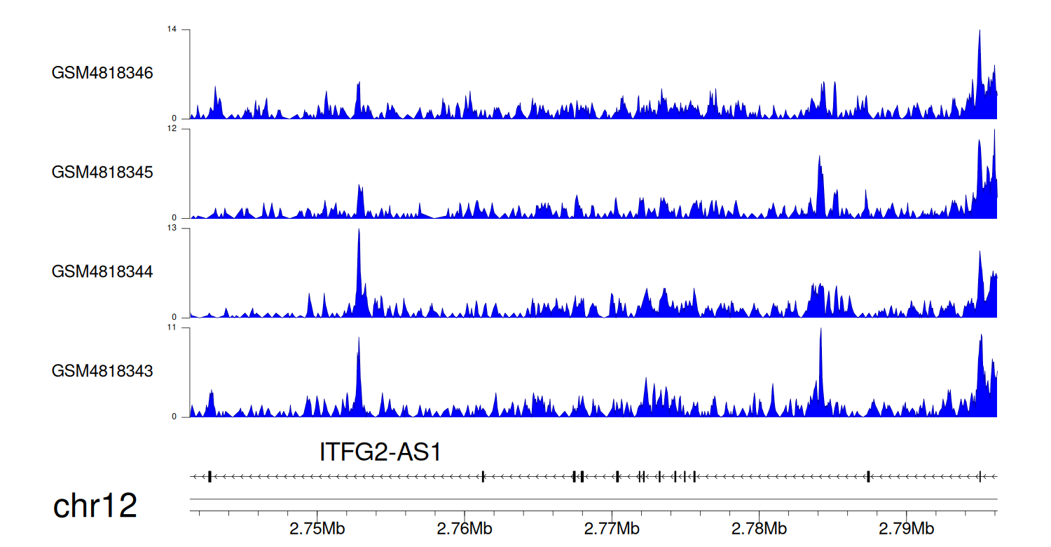 > Dataset: GSE131257 - ITFG2-AS1 peak across samples