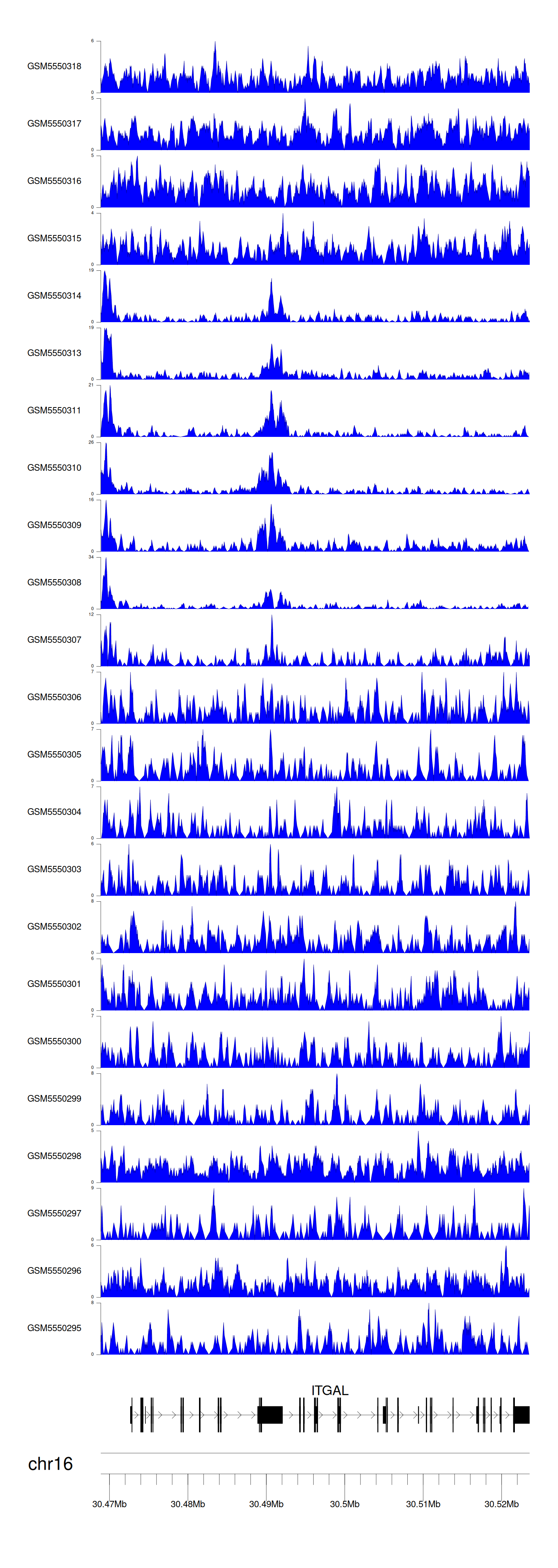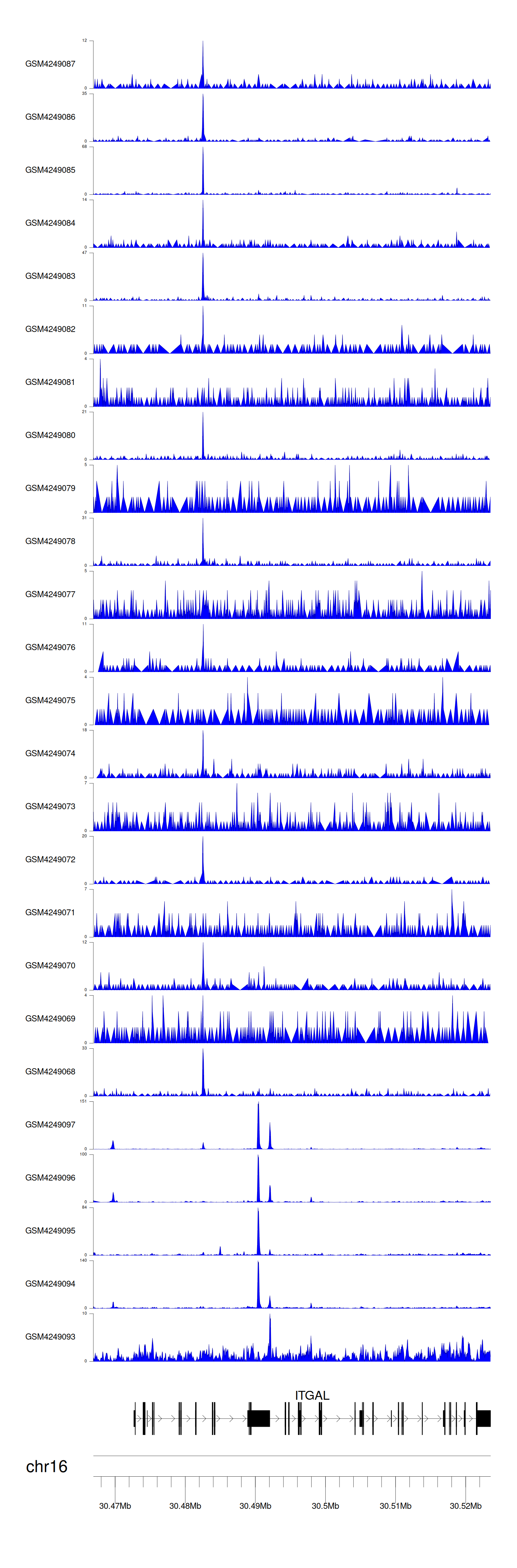 > Dataset: GSE143026 - ITGAL peak across samples