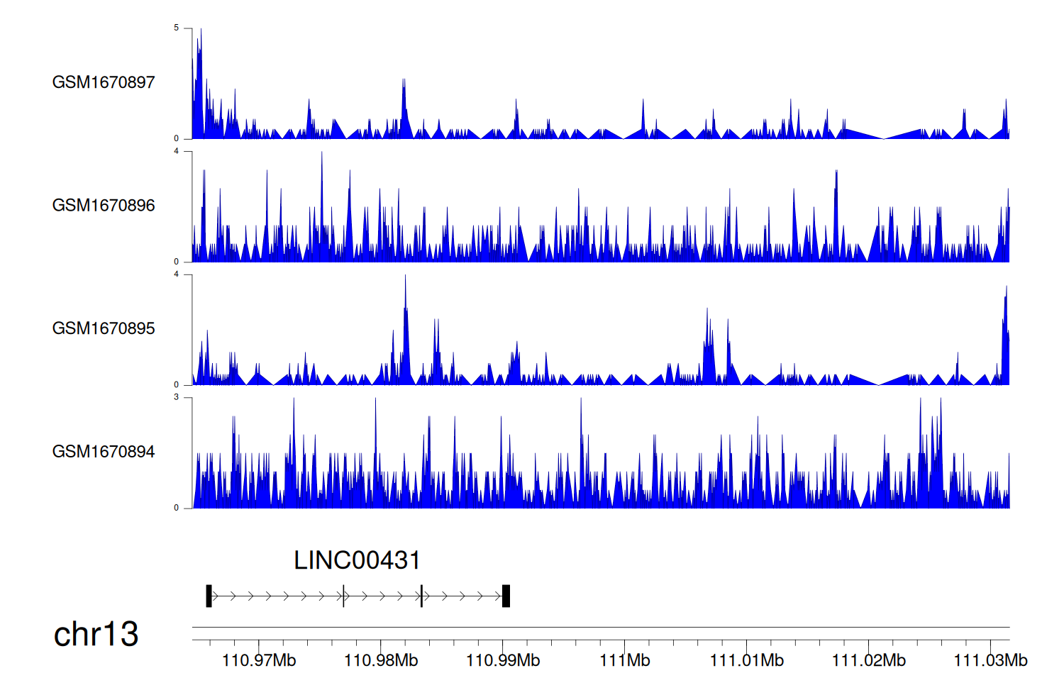 > Dataset: GSE35465 - LINC00431 peak across samples