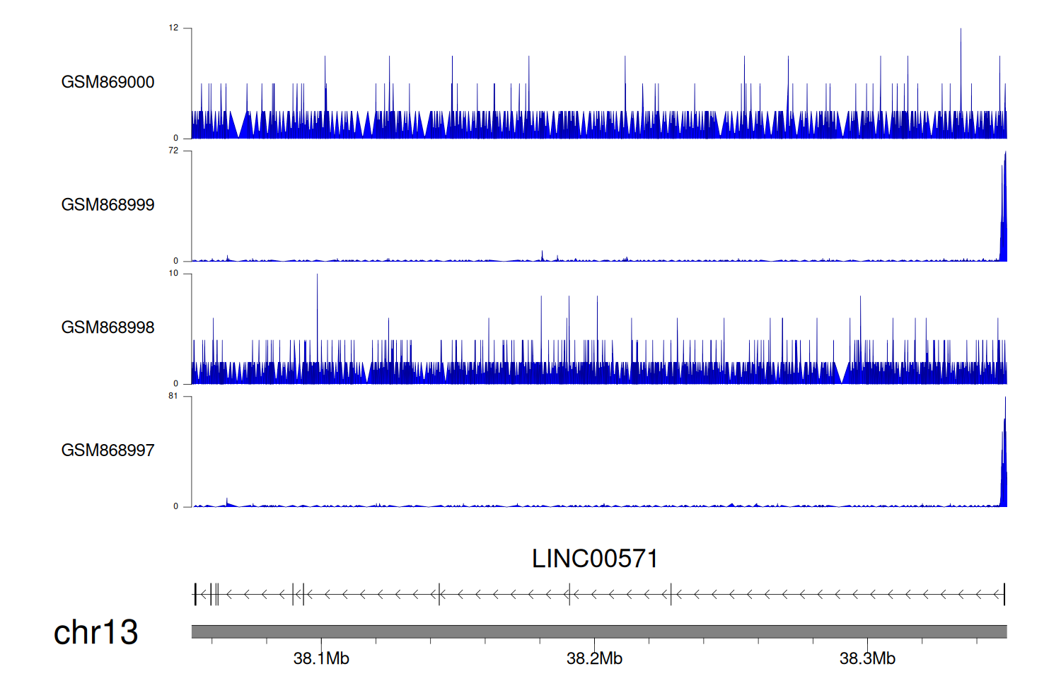 > Dataset: GSE68402 - LINC00571 peak across samples