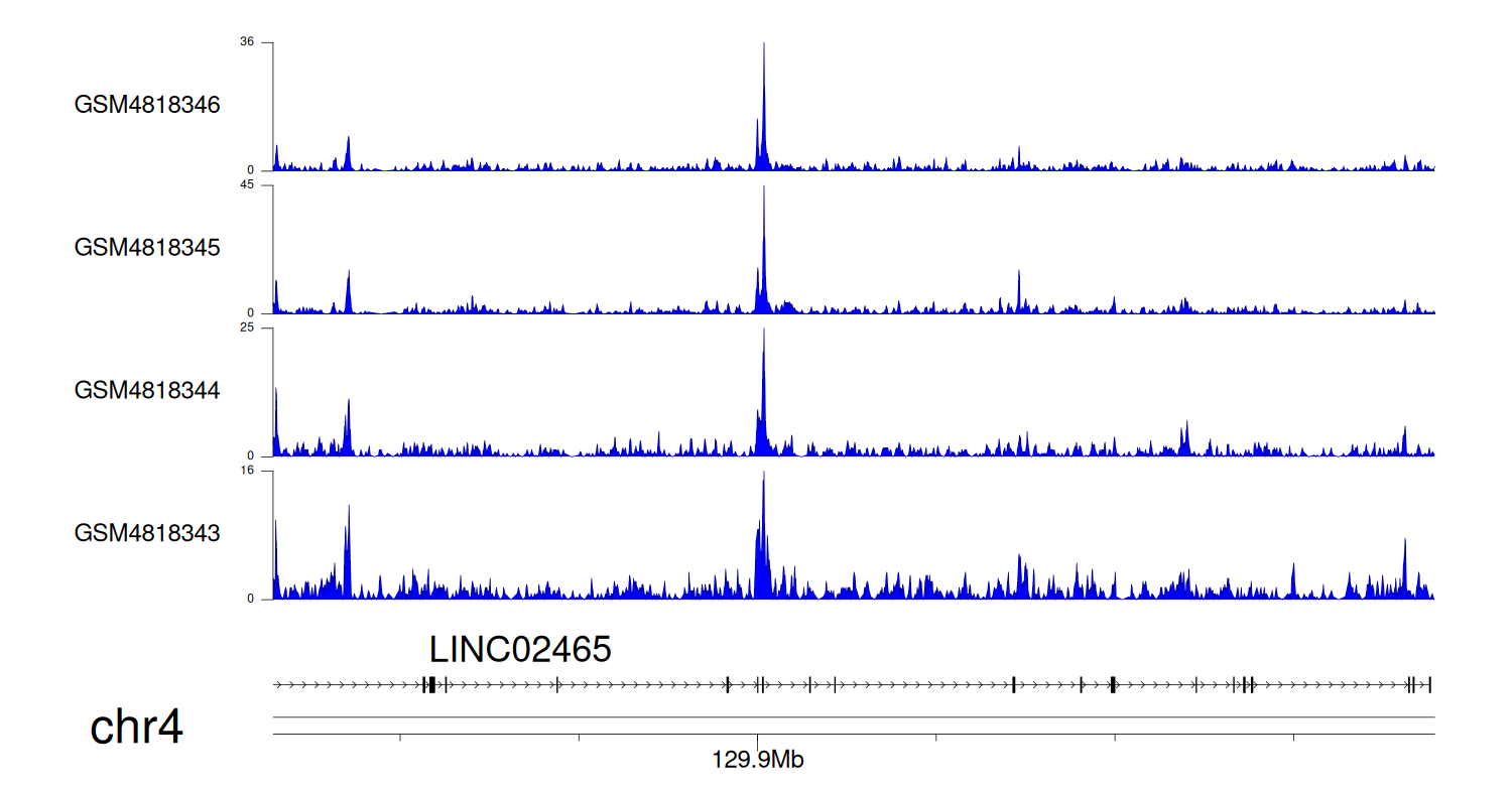 > Dataset: GSE131257 - LINC02465 peak across samples