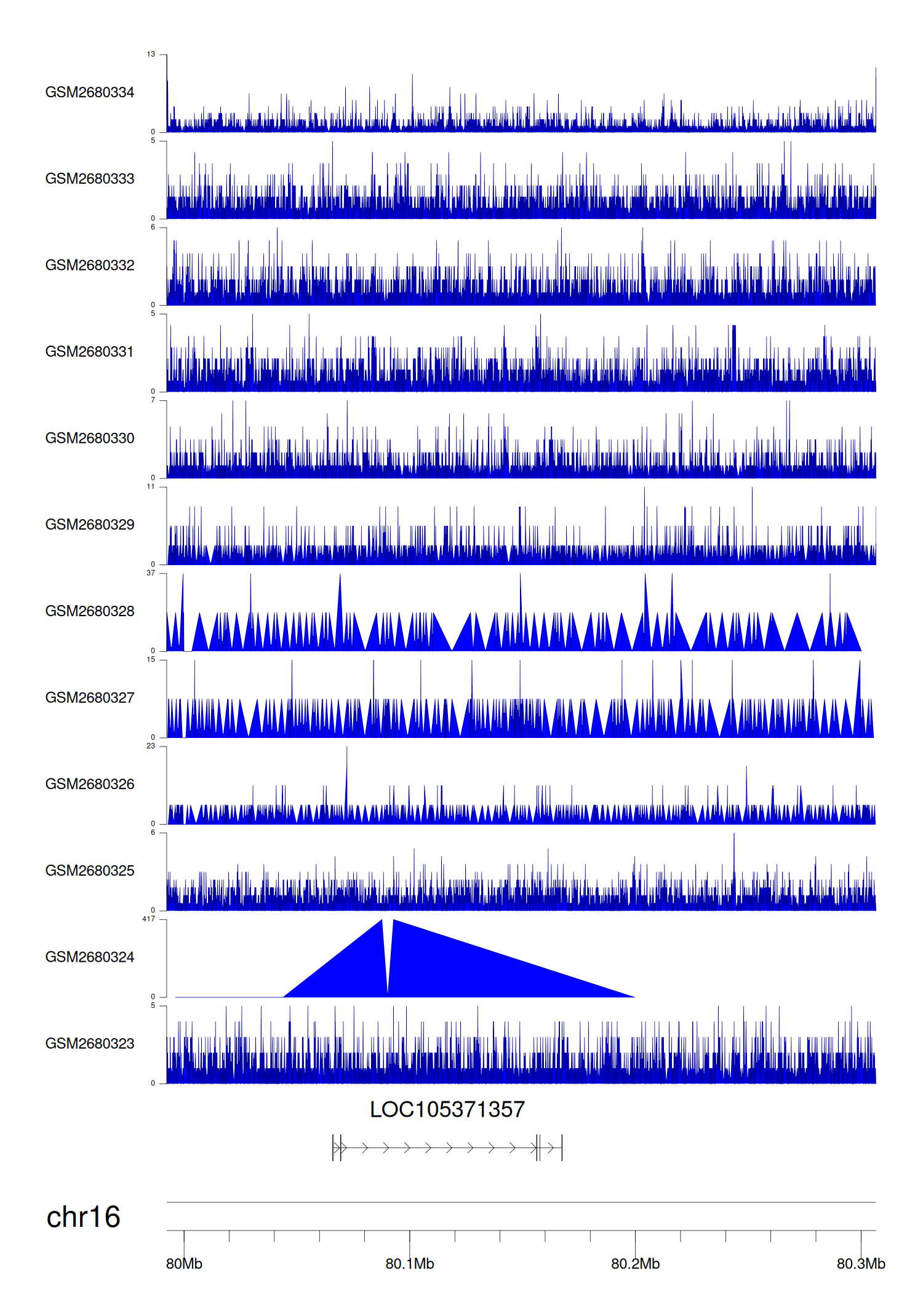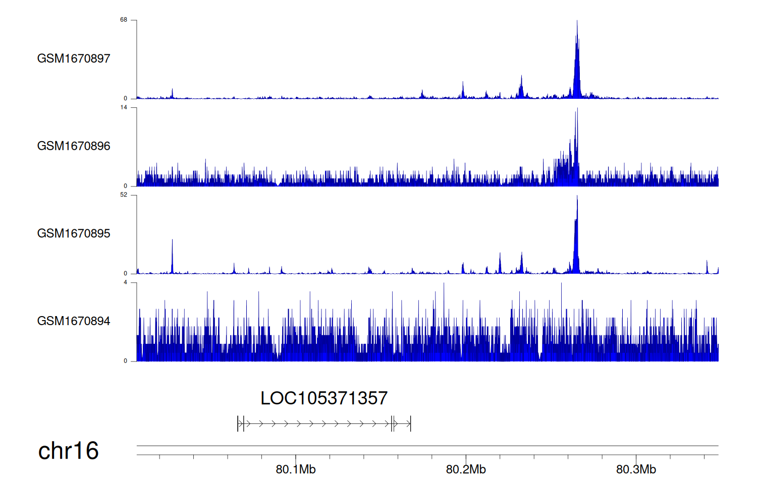 > Dataset: GSE68402 - LOC105371357 peak across samples