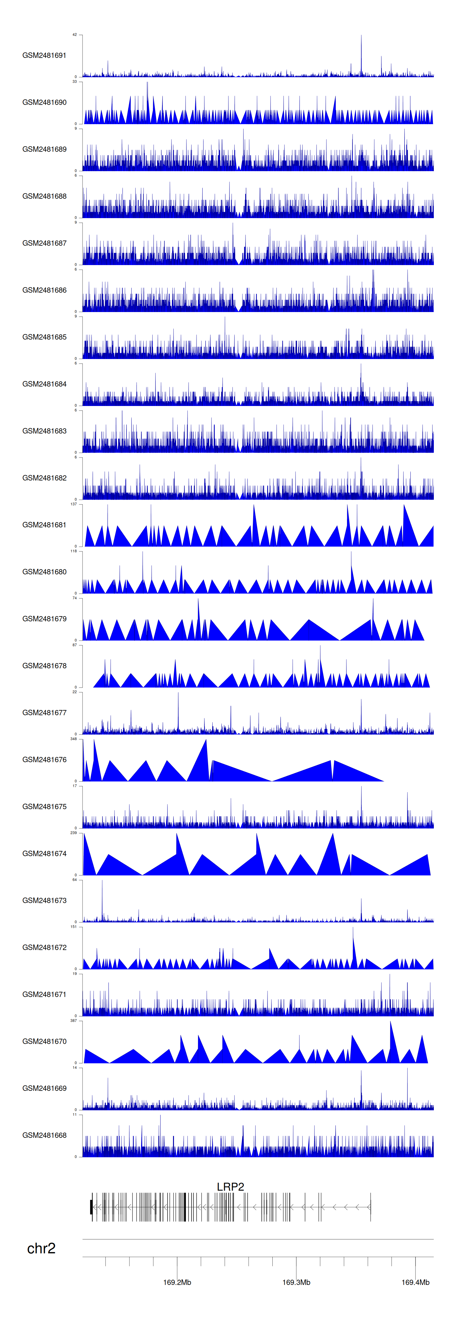 The protein encoded by this gene, low density lipoprotein-related protein 2 (LRP2) or megalin, is a multi-ligand endocytic receptor that is expressed in many different tissues but primarily in absorptive epithilial tissues such as the kidney. This glycoprotein has a large amino-terminal extracellular domain, a single transmembrane domain, and a short carboxy-terminal cytoplasmic tail. The extracellular ligand-binding-domains bind diverse macromolecules including albumin, apolipoproteins B and E, and lipoprotein lipase. The LRP2 protein is critical for the reuptake of numerous ligands, including lipoproteins, sterols, vitamin-binding proteins, and hormones. This protein also has a role in cell-signaling; extracellular ligands include parathyroid horomones and the morphogen sonic hedgehog while cytosolic ligands include MAP kinase scaffold proteins and JNK interacting proteins. Recycling of this membrane receptor is regulated by phosphorylation of its cytoplasmic domain. Mutations in this gene cause Donnai-Barrow syndrome (DBS) and facio-oculoacoustico-renal syndrome (FOAR).[provided by RefSeq, Aug 2009] |