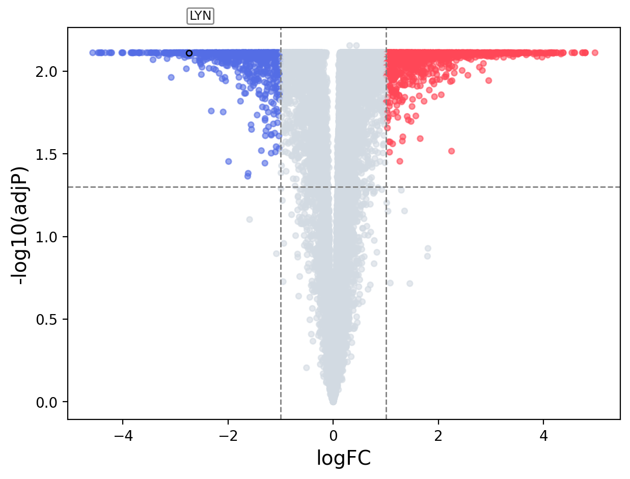 When the query gene is differentially changed in the dataset, a volcano/bar plot will be displayed.
