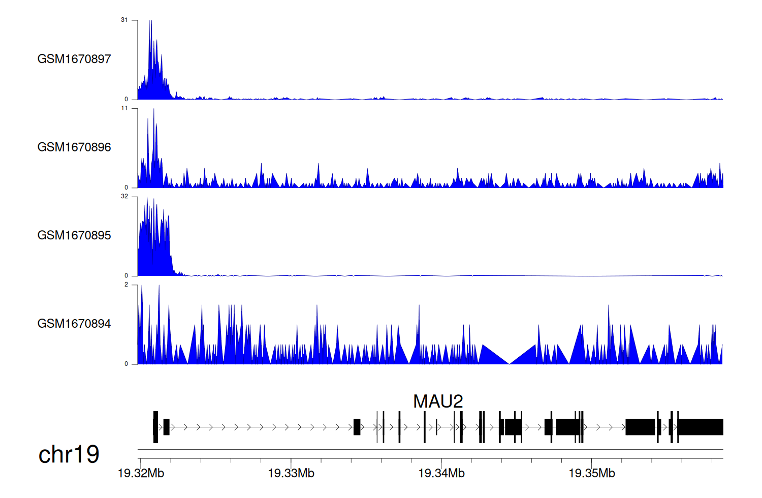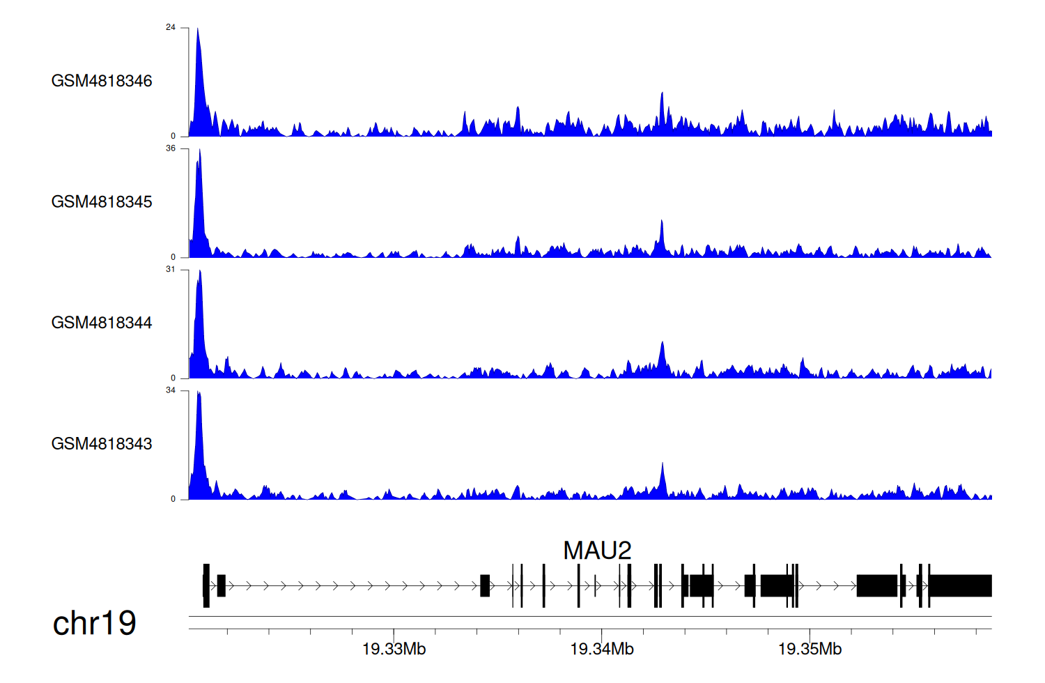 > Dataset: GSE35465 - MAU2 peak across samples