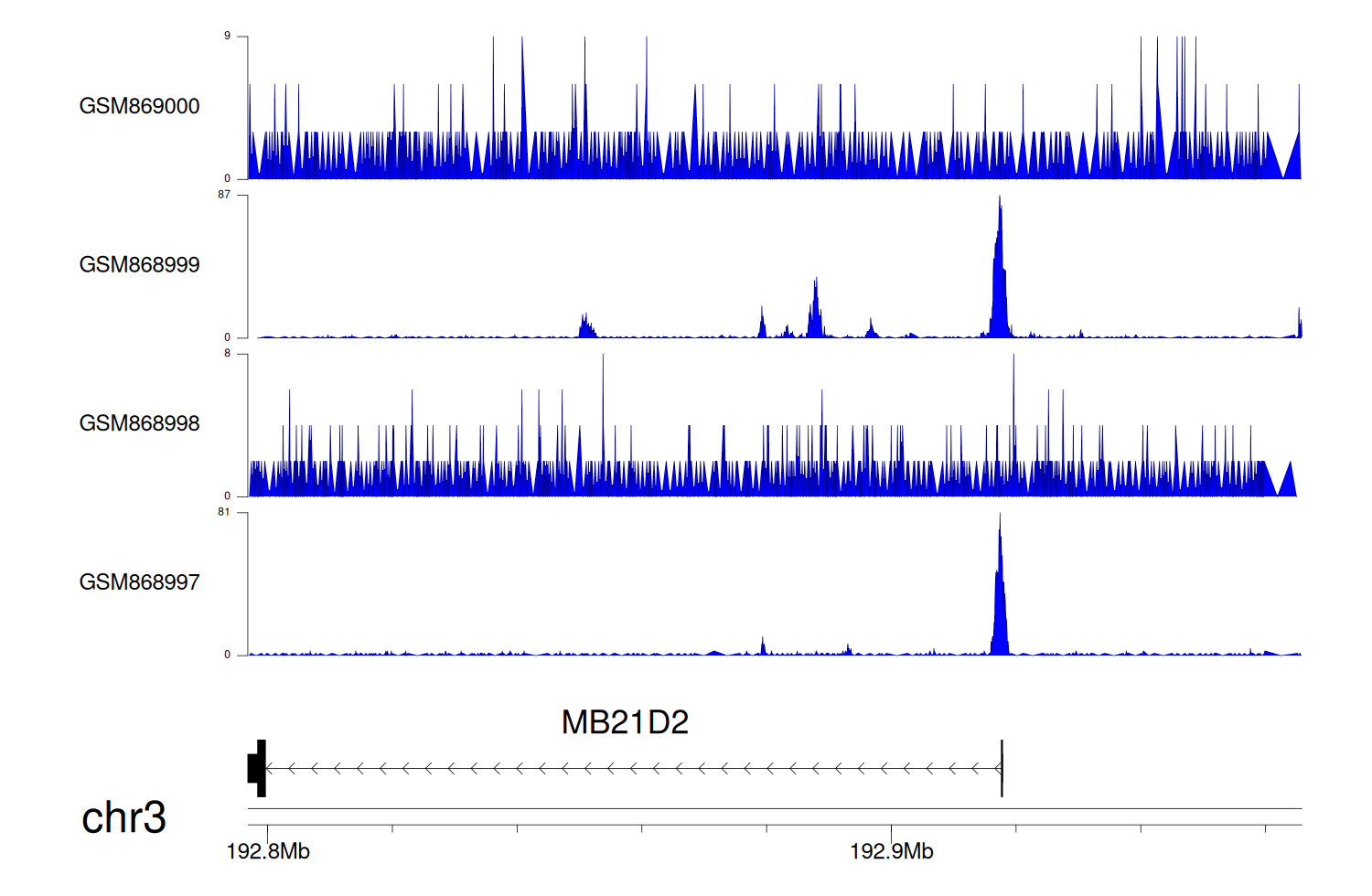 > Dataset: GSE131257 - MB21D2 peak across samples