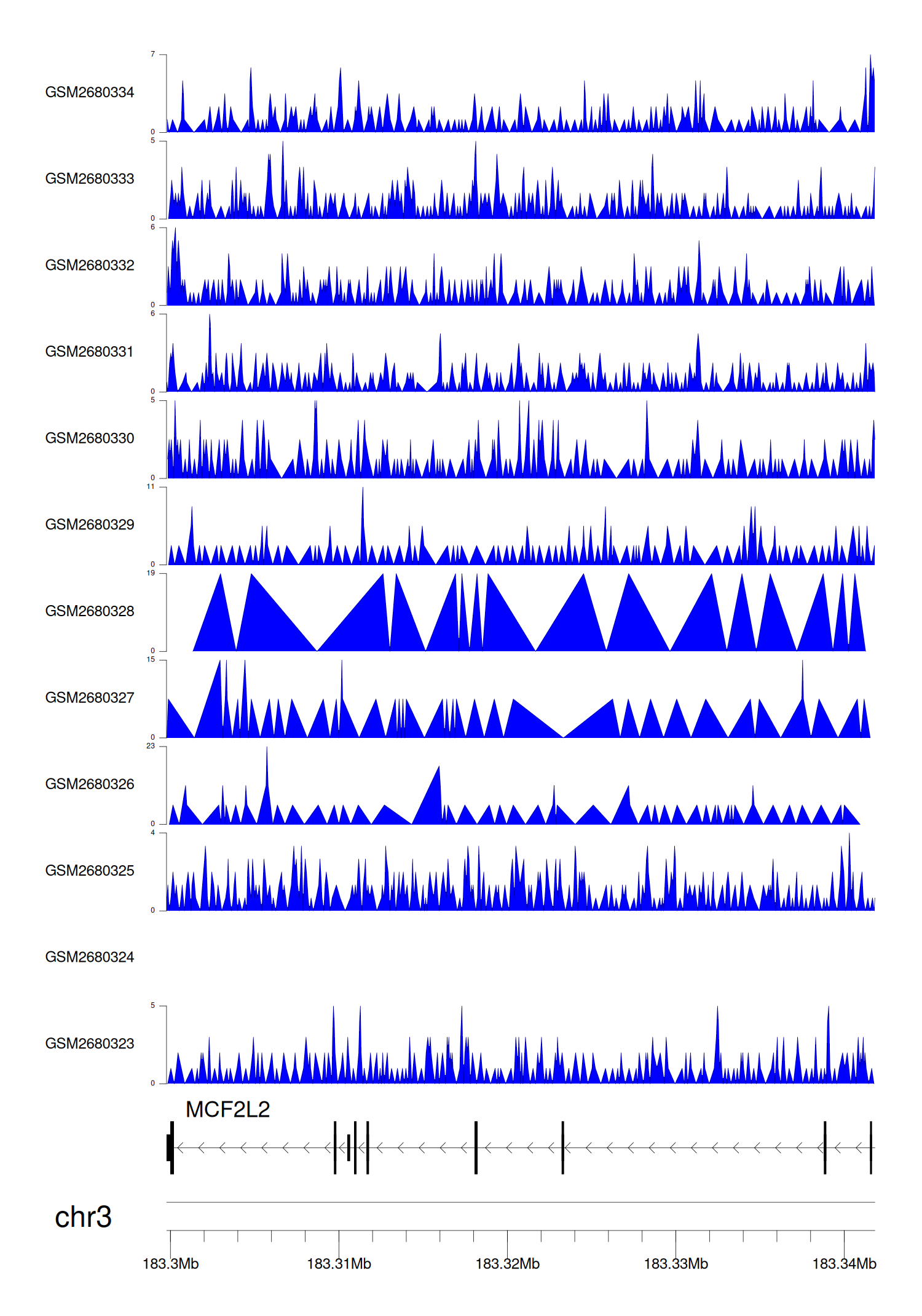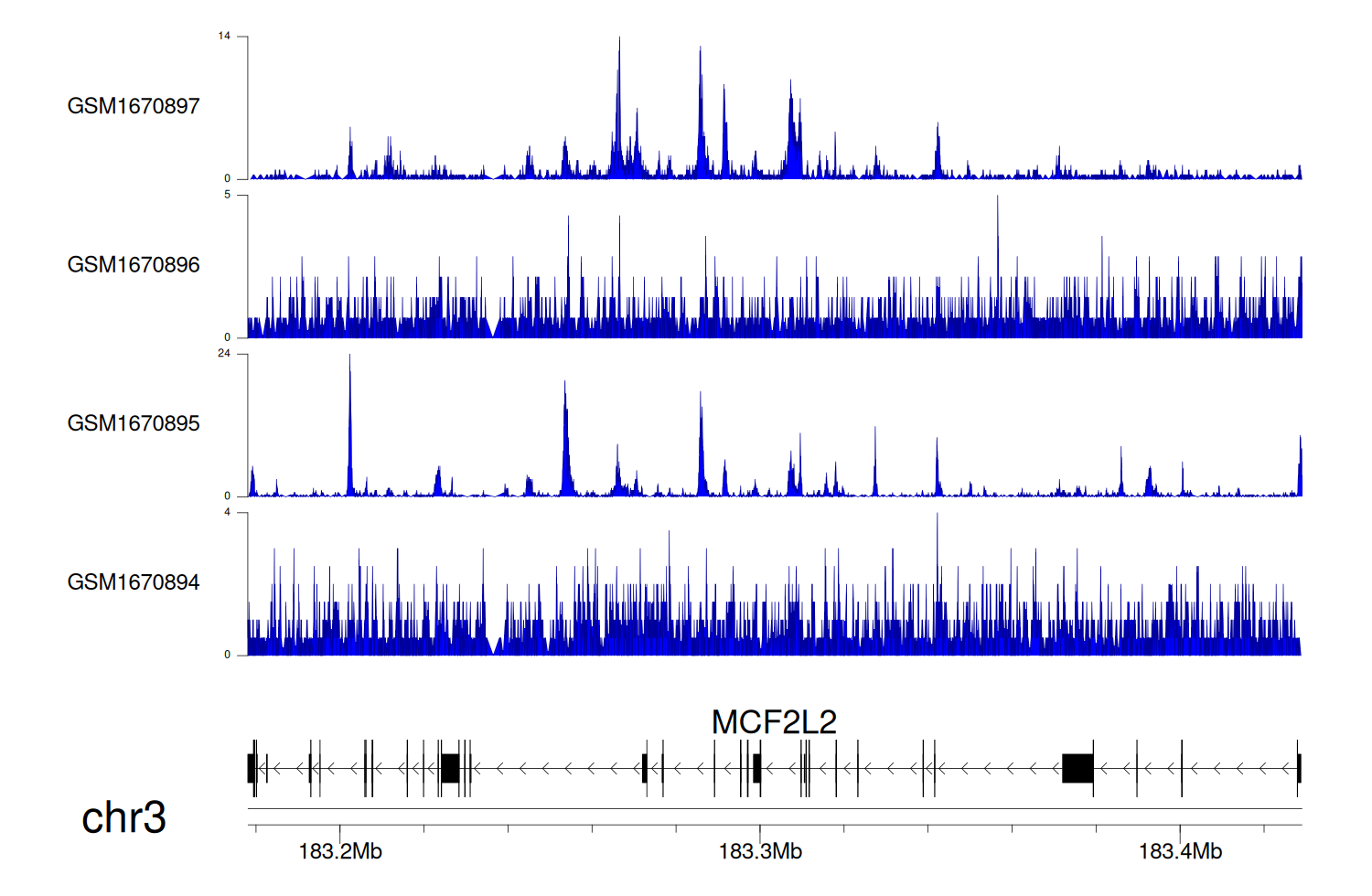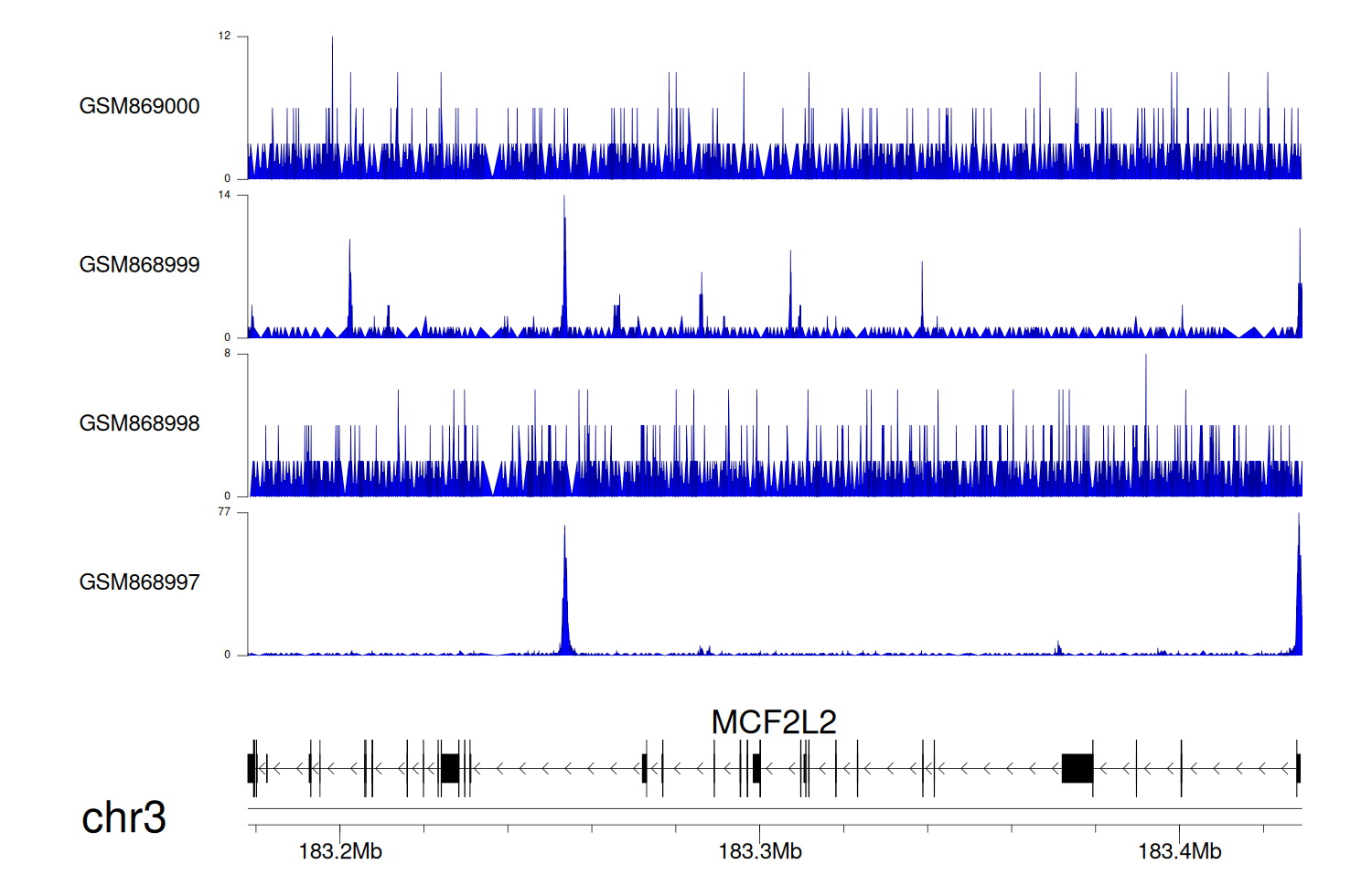 > Dataset: GSE68402 - MCF2L2 peak across samples