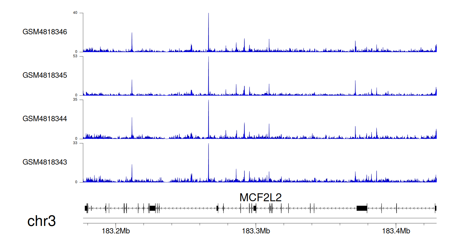 > Dataset: GSE131257 - MCF2L2 peak across samples