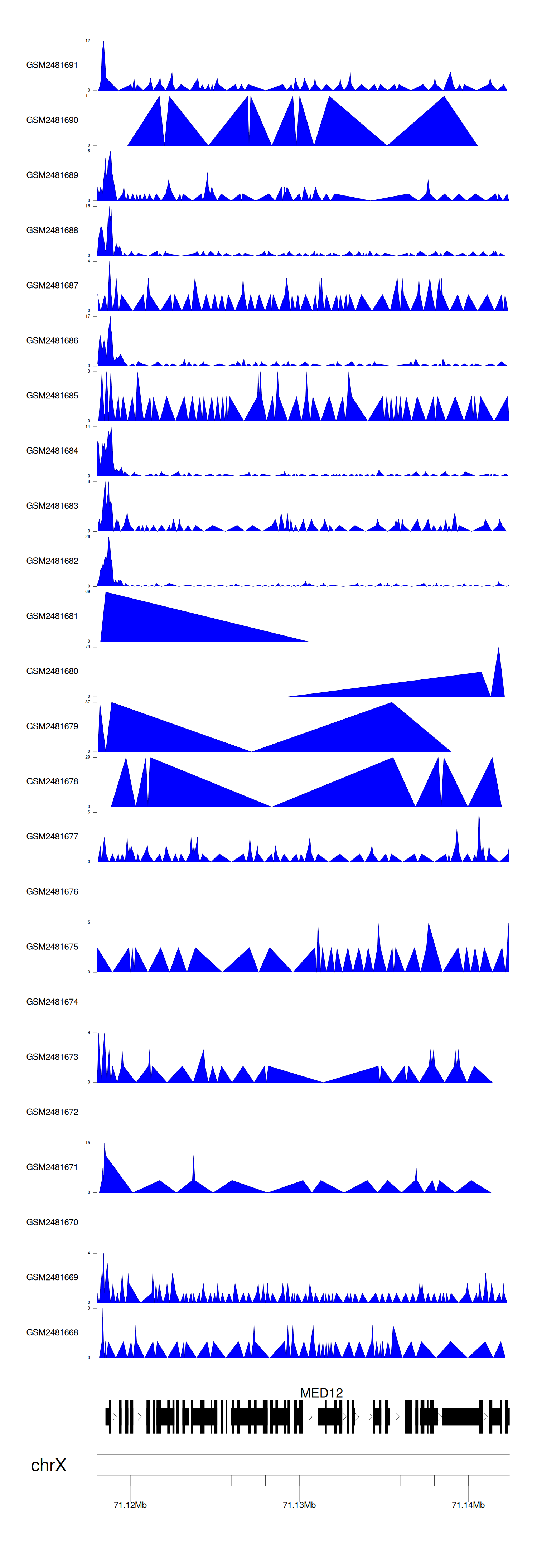The initiation of transcription is controlled in part by a large protein assembly known as the preinitiation complex. A component of this preinitiation complex is a 1.2 MDa protein aggregate called Mediator. This Mediator component binds with a CDK8 subcomplex which contains the protein encoded by this gene, mediator complex subunit 12 (MED12), along with MED13, CDK8 kinase, and cyclin C. The CDK8 subcomplex modulates Mediator-polymerase II interactions and thereby regulates transcription initiation and reinitation rates. The MED12 protein is essential for activating CDK8 kinase. Defects in this gene cause X-linked Opitz-Kaveggia syndrome, also known as FG syndrome, and Lujan-Fryns syndrome. [provided by RefSeq, Aug 2009] |