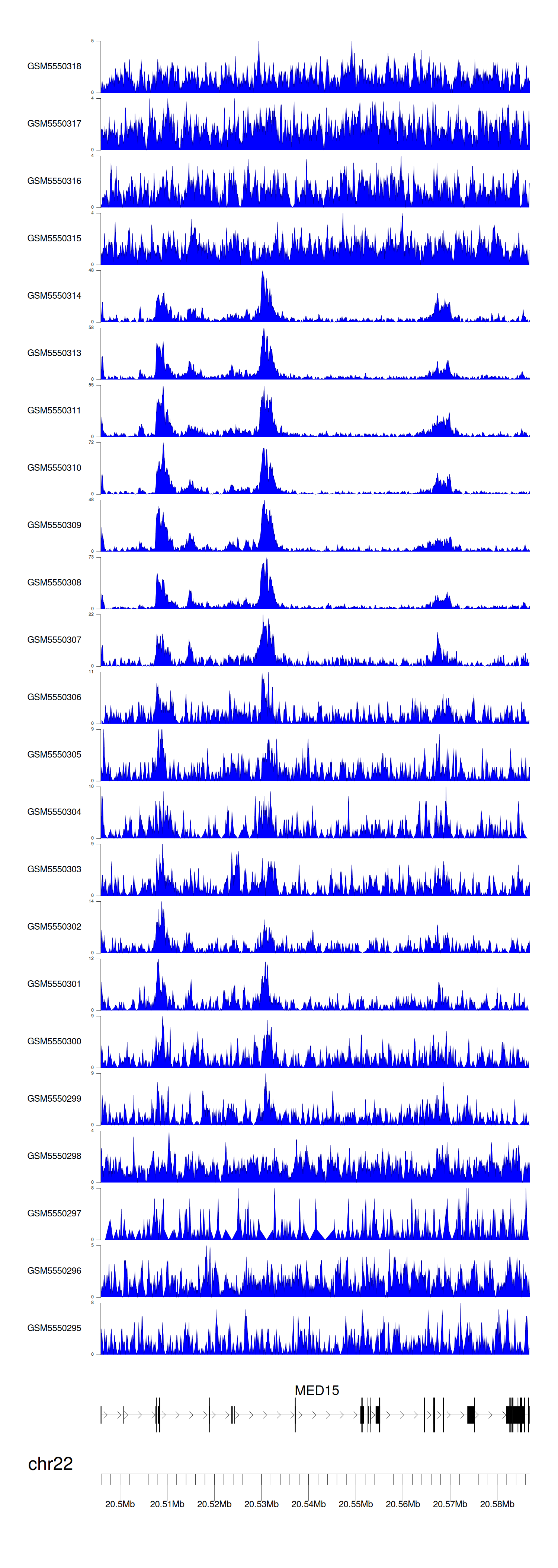 Summary The protein encoded by this gene is a subunit of the multiprotein complexes PC2 and ARC/DRIP and may function as a transcriptional coactivator in RNA polymerase II transcription. This gene contains stretches of trinucleotide repeats and is located in the chromosome 22 region which is deleted in DiGeorge syndrome. Alternative splicing results in multiple transcript variants. [provided by RefSeq, Jun 2014]
