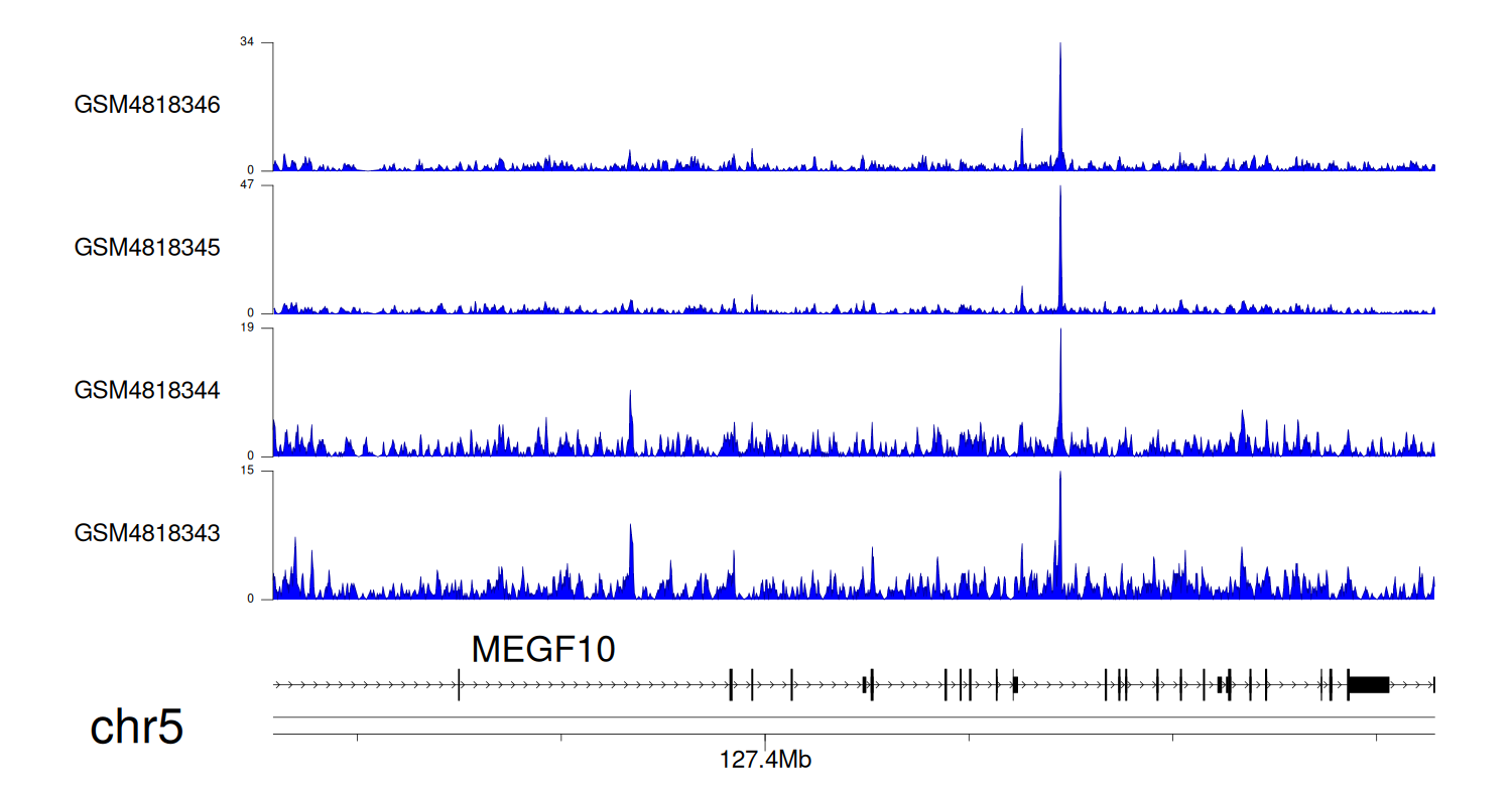 > Dataset: GSE131257 - MEGF10 peak across samples