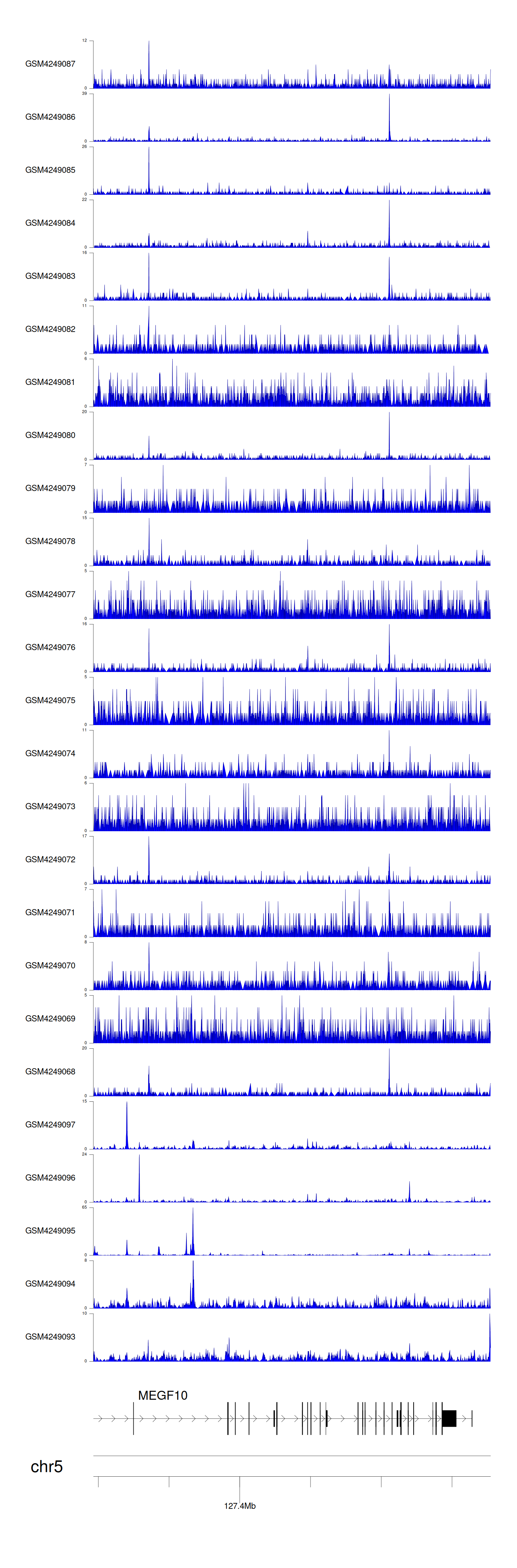 > Dataset: GSE143026 - MEGF10 peak across samples