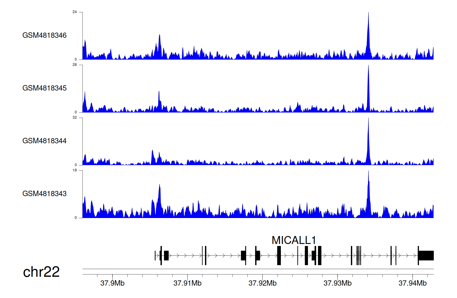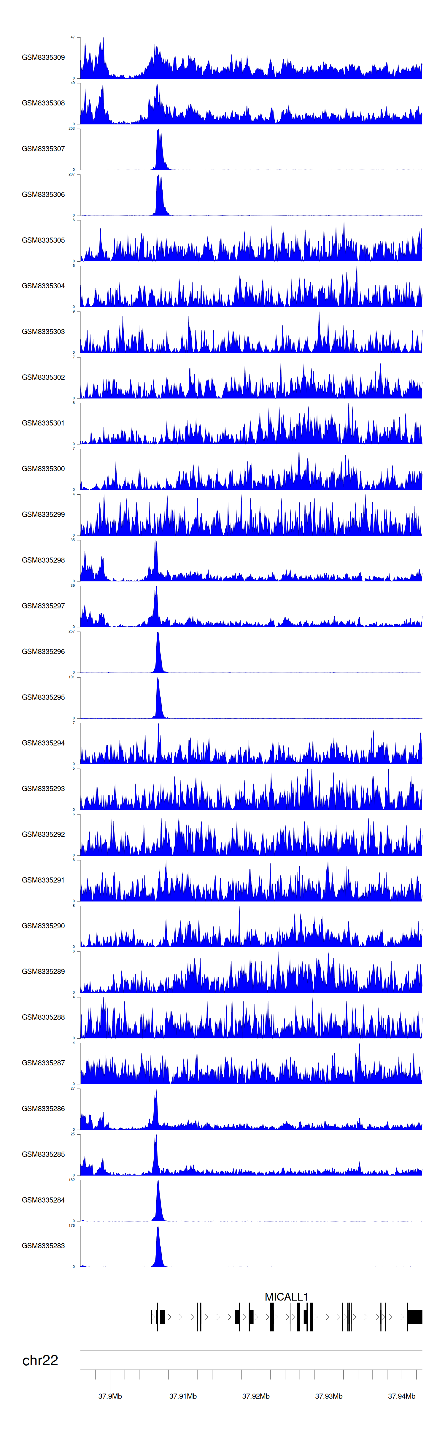 > Dataset: GSE131257 - MICALL1 peak across samples