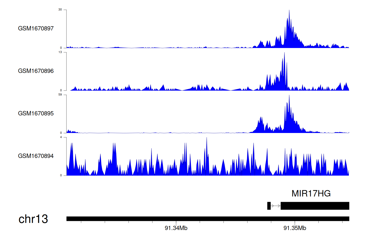> Dataset: GSE35465 - MIR17HG peak across samples