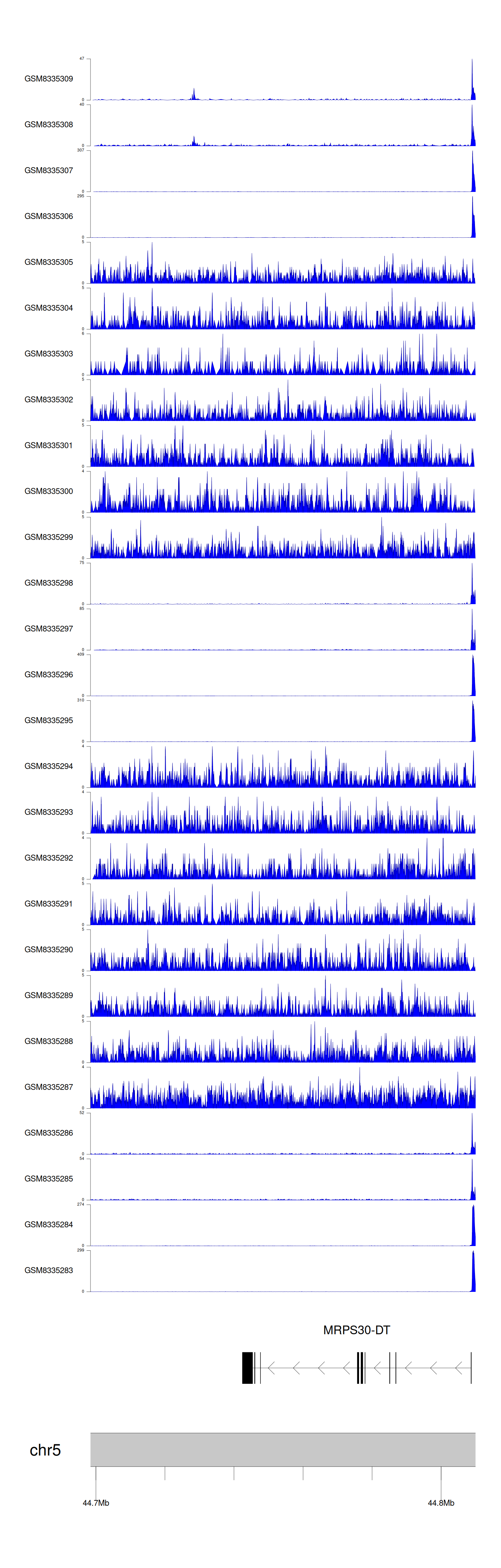 > Dataset: GSE131257 - MRPS30-DT peak across samples