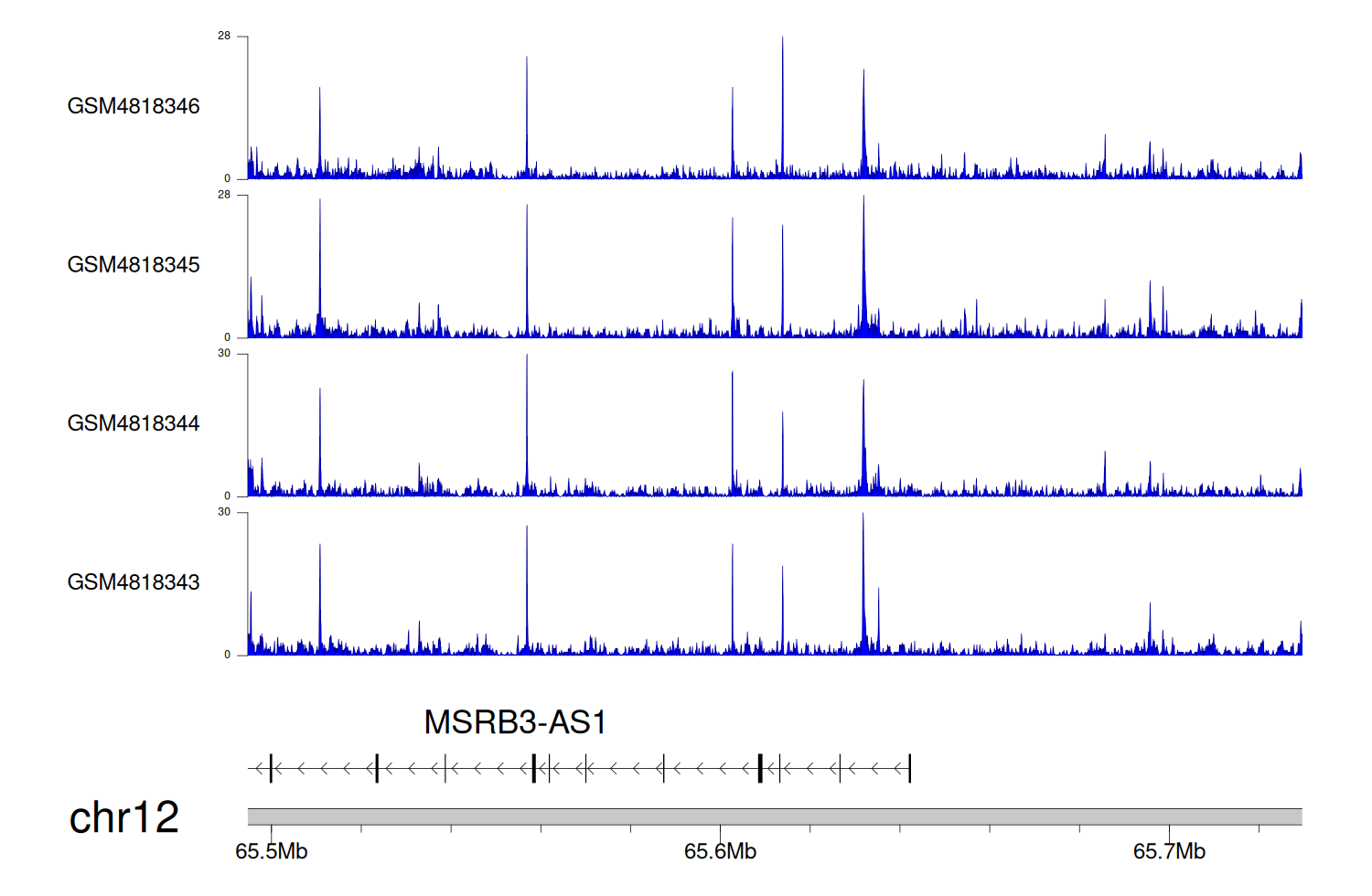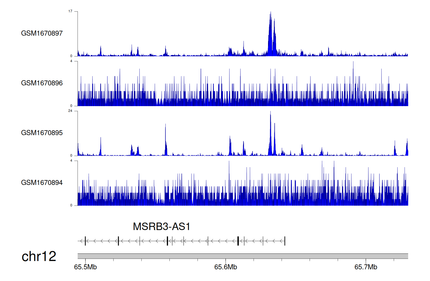 > Dataset: GSE68402 - MSRB3-AS1 peak across samples