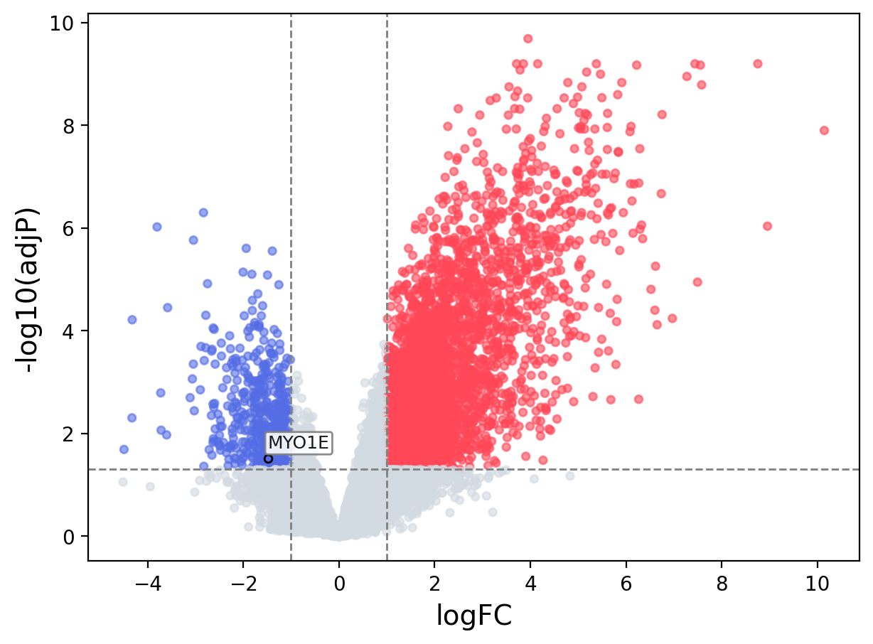 When the query gene is differentially changed in the dataset, a volcano/bar plot will be displayed.